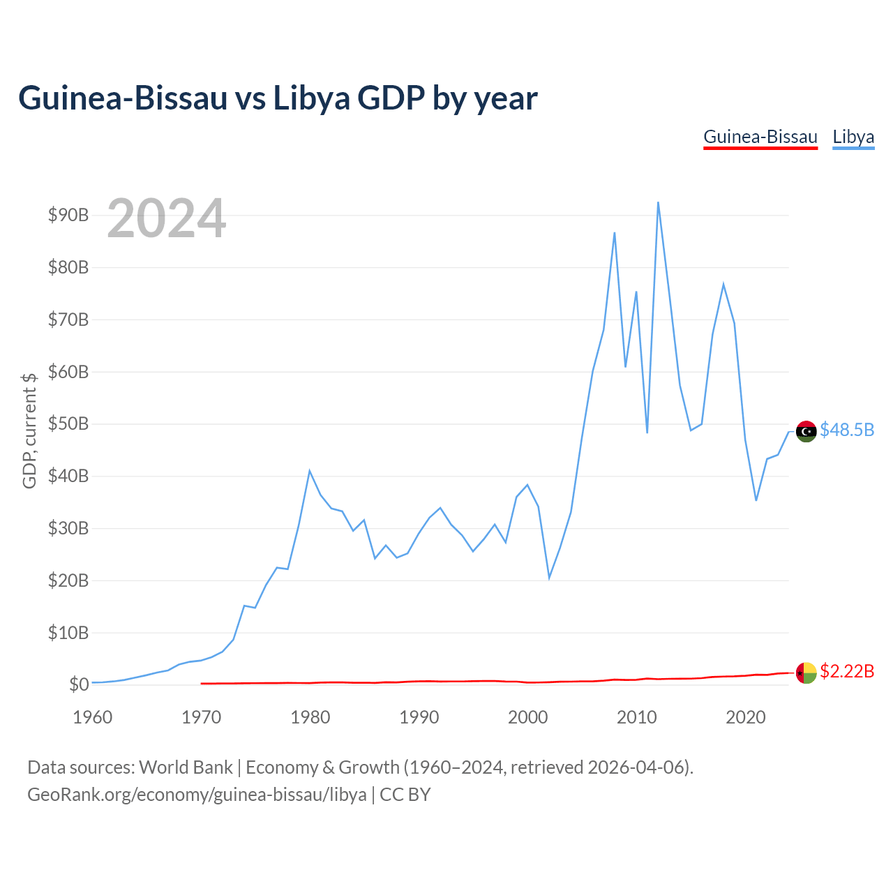 Guinea-Bissau has a GDP of $2.22B compared to $48.5B for Libya, ranking 176/197 and 95/197 by economy size, respectively.