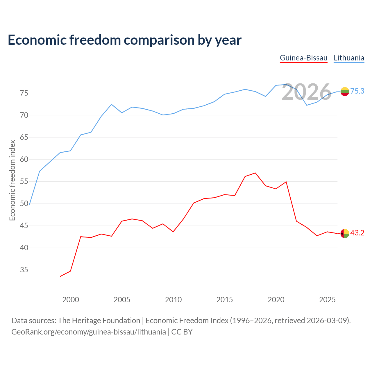 The Economic Freedom Index for Guinea-Bissau is 43.2, ranking 181/197, compared to 75.3 for Lithuania, ranking 18/197. The chart above displays a comparison of annual changes in economic freedom indexes.