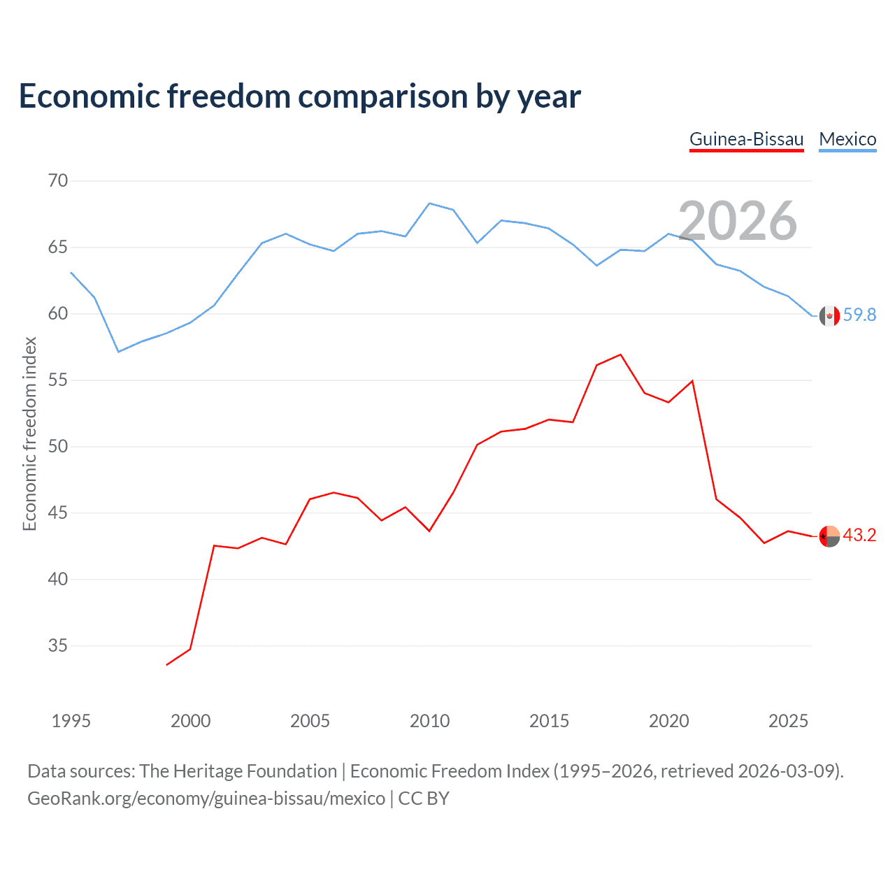 The Economic Freedom Index for Guinea-Bissau is 43.2, ranking 181/197, compared to 59.8 for Mexico, ranking 102/197. The chart above displays a comparison of annual changes in economic freedom indexes.