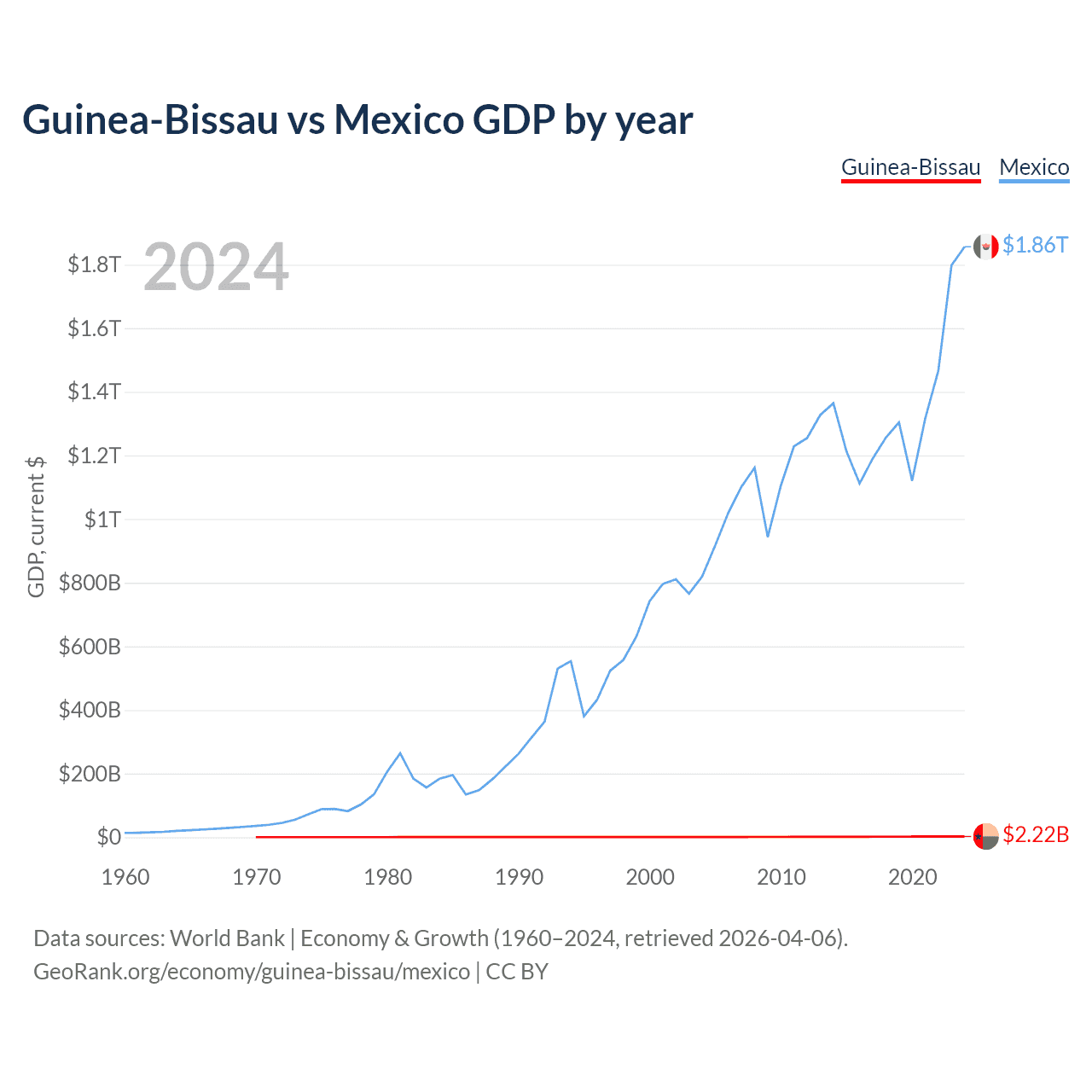 Guinea-Bissau has a GDP of $2.22B compared to $1.86T for Mexico, ranking 176/197 and 13/197 by economy size, respectively.