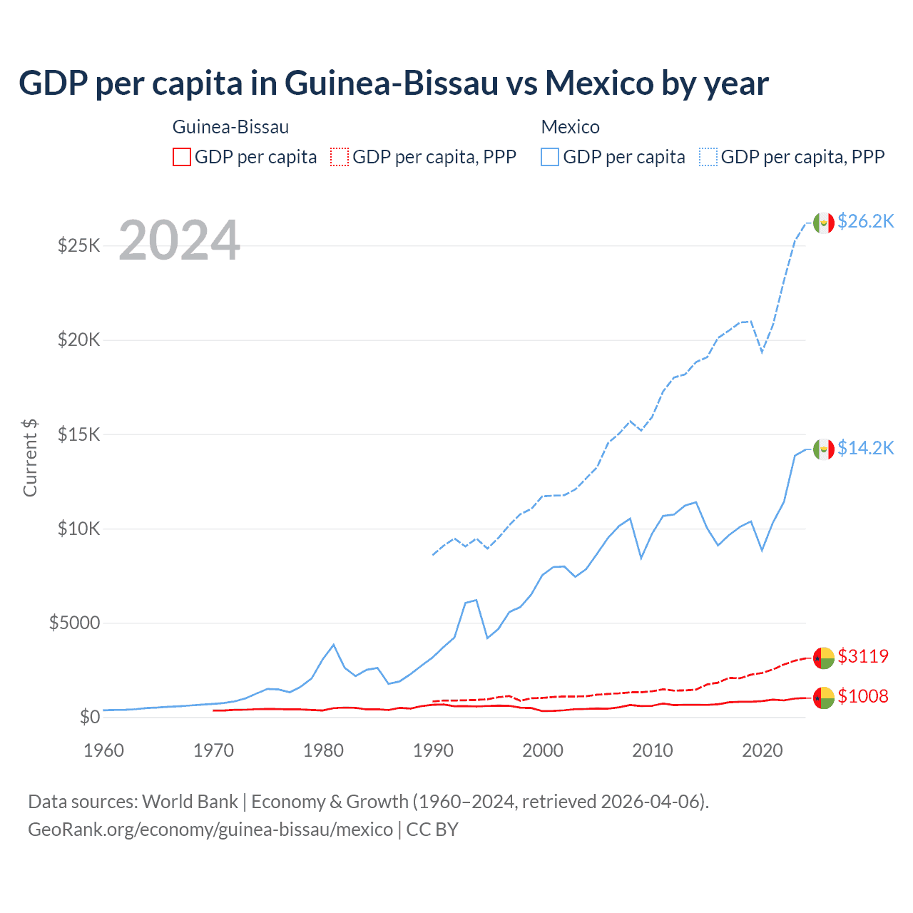 GDP per capita in Guinea-Bissau vs Mexico by year