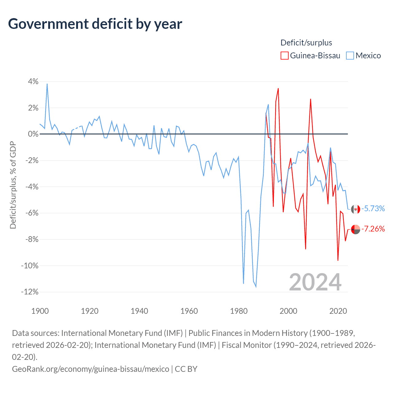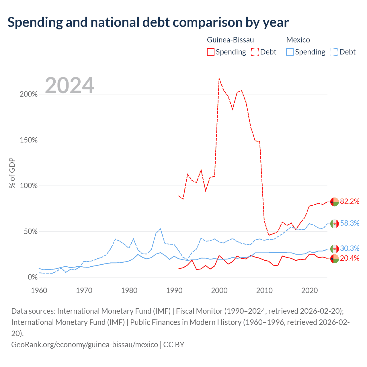 Guinea-Bissau has $1.82B in government debt (82.2% of GDP), compared to $1.08T (58.3% of GDP) in Mexico.