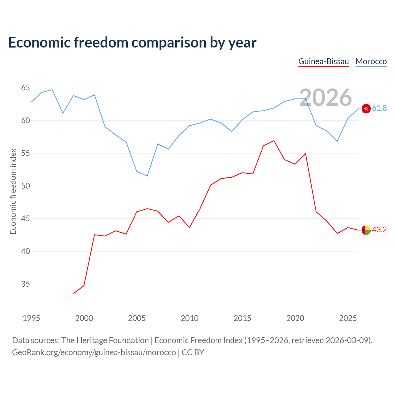 The Economic Freedom Index for Guinea-Bissau is 43.2, ranking 181/197, compared to 61.8 for Morocco, ranking 91/197. The chart above displays a comparison of annual changes in economic freedom indexes.