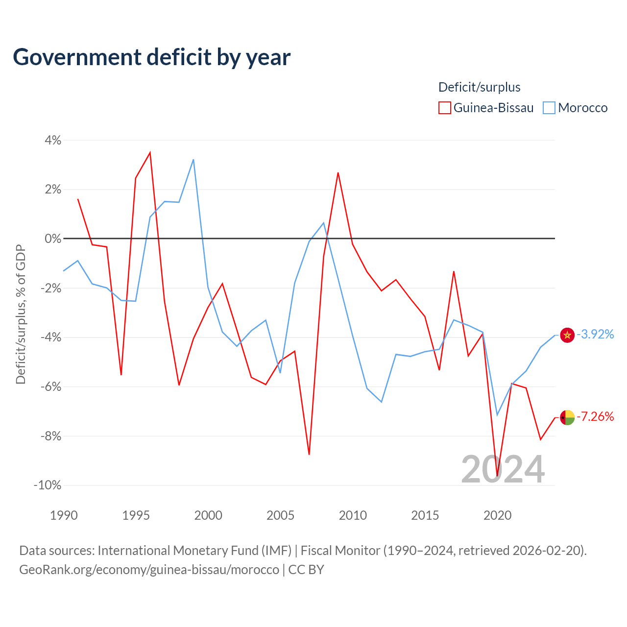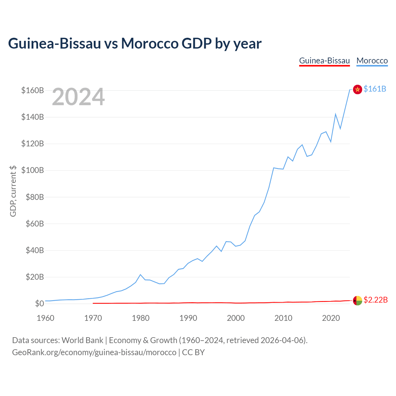 Guinea-Bissau has a GDP of $2.22B compared to $161B for Morocco, ranking 176/197 and 58/197 by economy size, respectively.