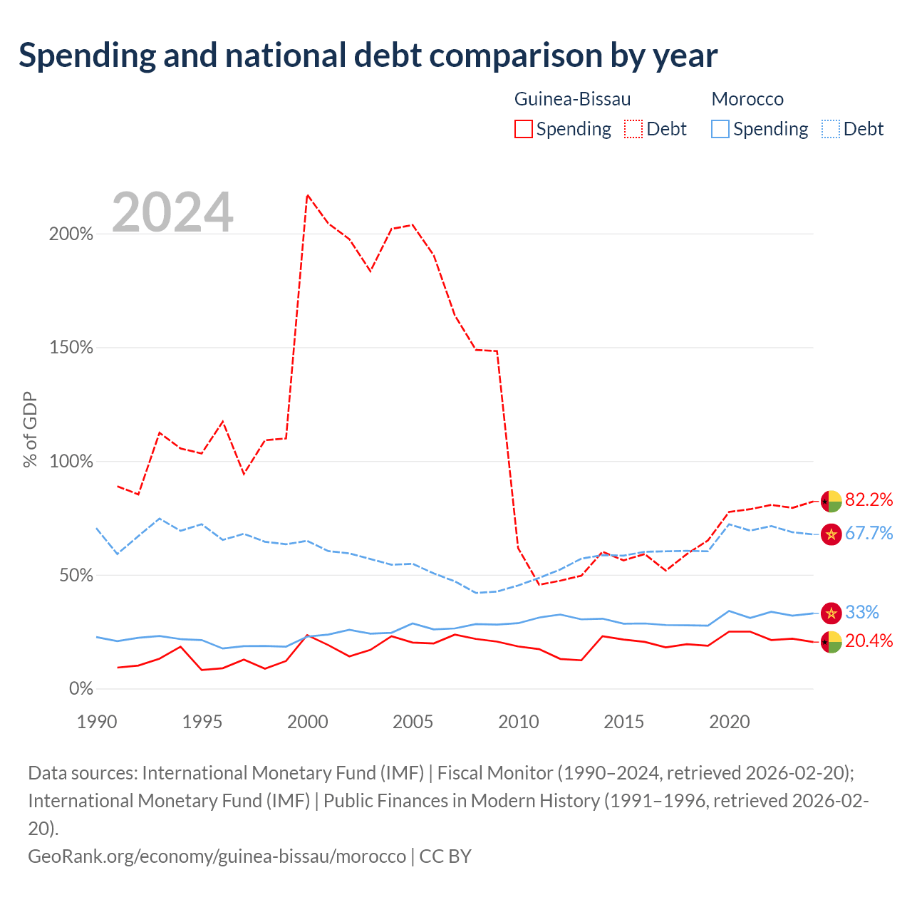 Guinea-Bissau has $1.82B in government debt (82.2% of GDP), compared to $109B (67.7% of GDP) in Morocco.
