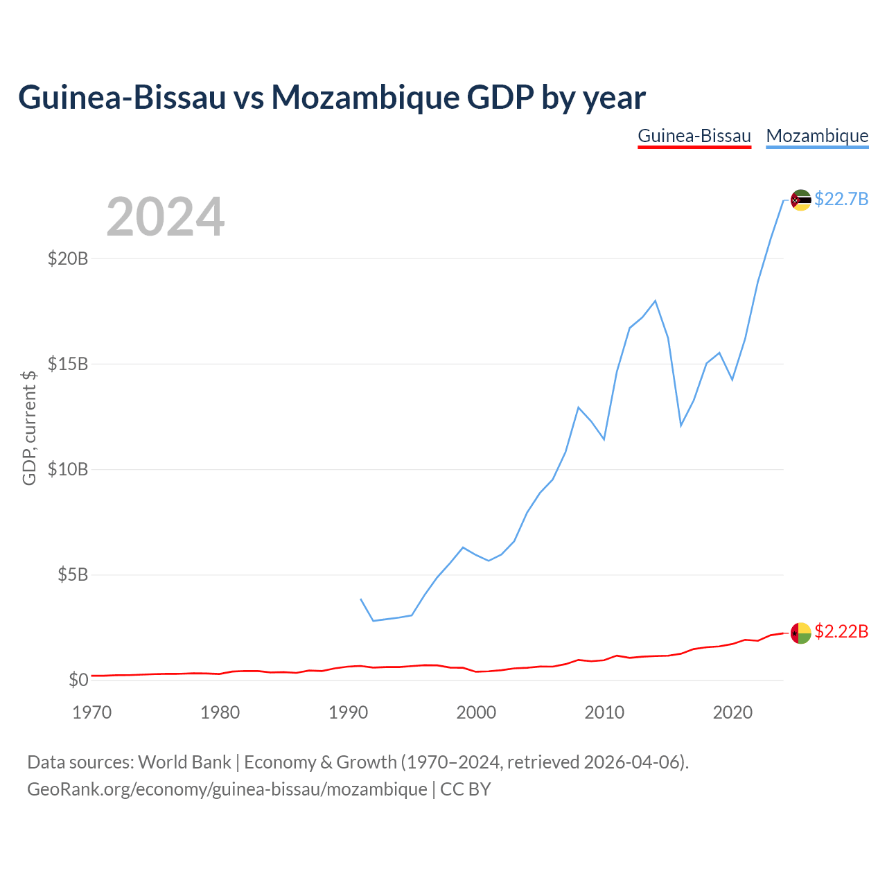 Guinea-Bissau has a GDP of $2.22B compared to $22.7B for Mozambique, ranking 176/197 and 123/197 by economy size, respectively.