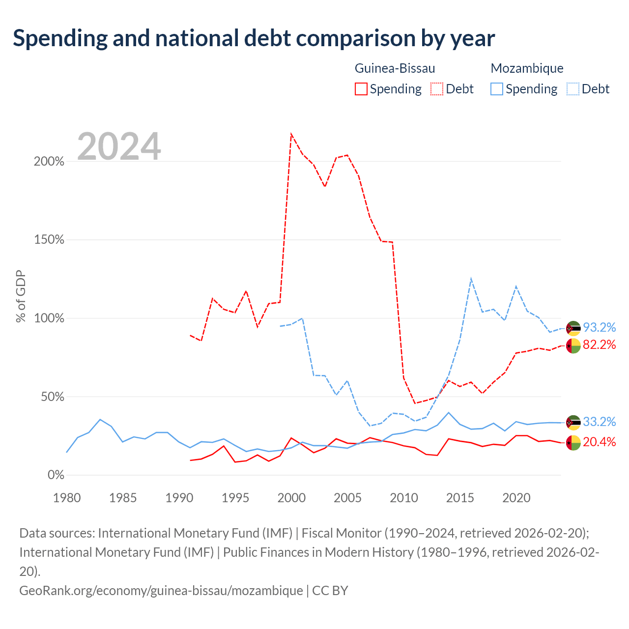 Guinea-Bissau has $1.82B in government debt (82.2% of GDP), compared to $21.2B (93.2% of GDP) in Mozambique.