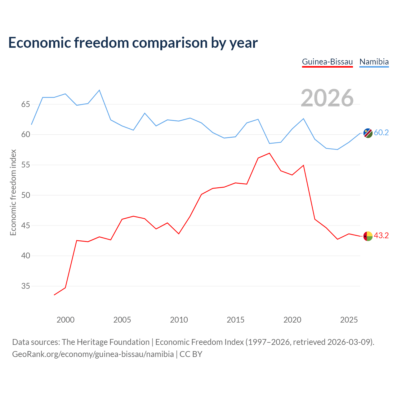The Economic Freedom Index for Guinea-Bissau is 43.2, ranking 181/197, compared to 60.2 for Namibia, ranking 95/197. The chart above displays a comparison of annual changes in economic freedom indexes.