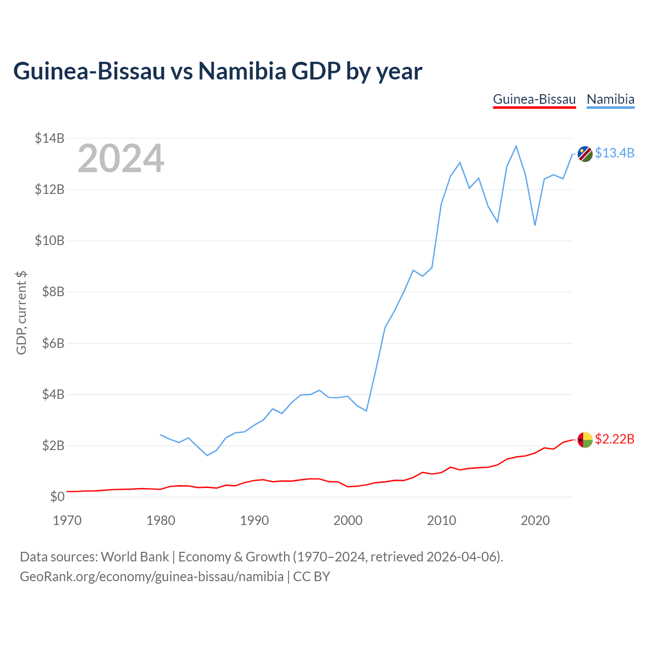 Guinea-Bissau has a GDP of $2.22B compared to $13.4B for Namibia, ranking 176/197 and 147/197 by economy size, respectively.