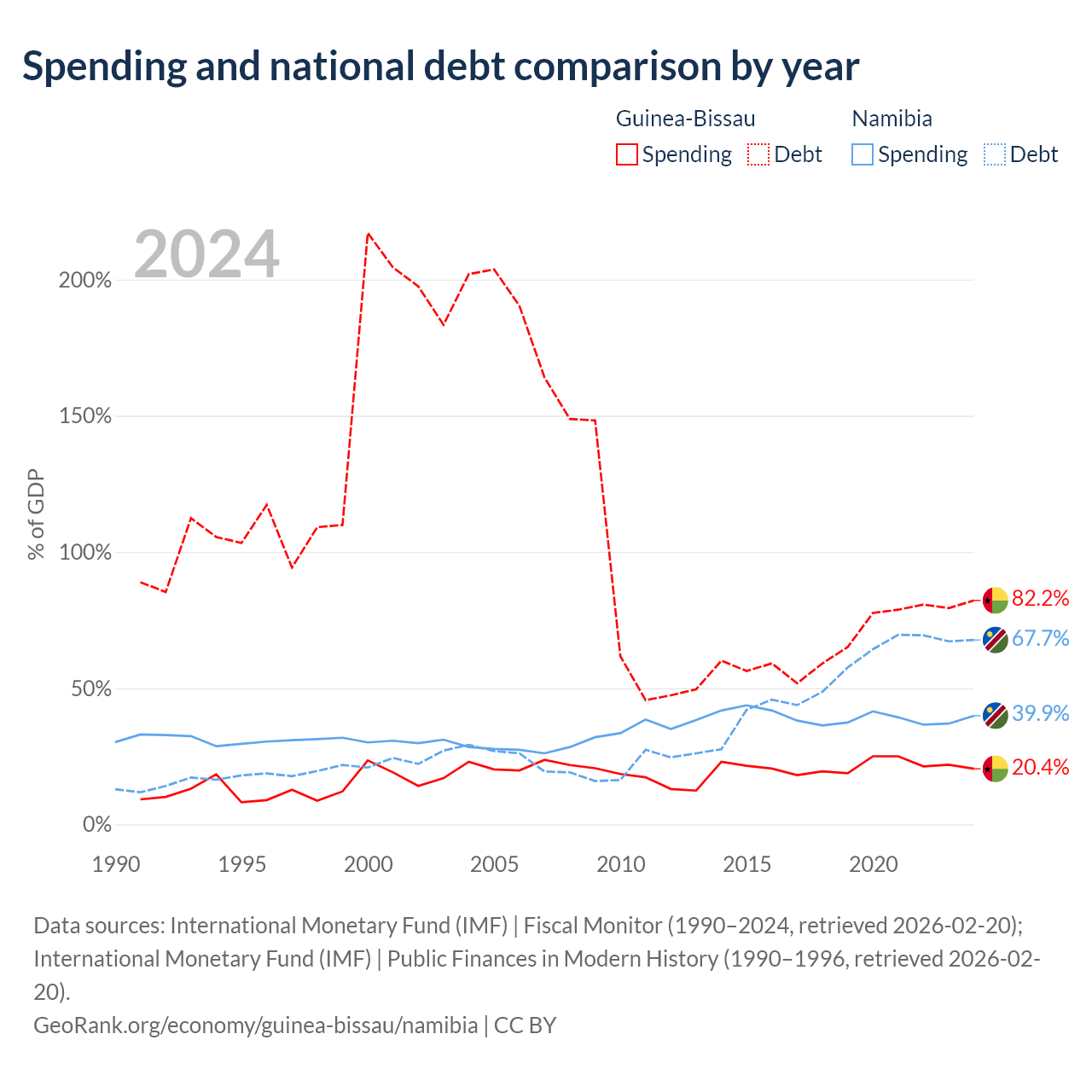 Guinea-Bissau has $1.82B in government debt (82.2% of GDP), compared to $9.05B (67.7% of GDP) in Namibia.