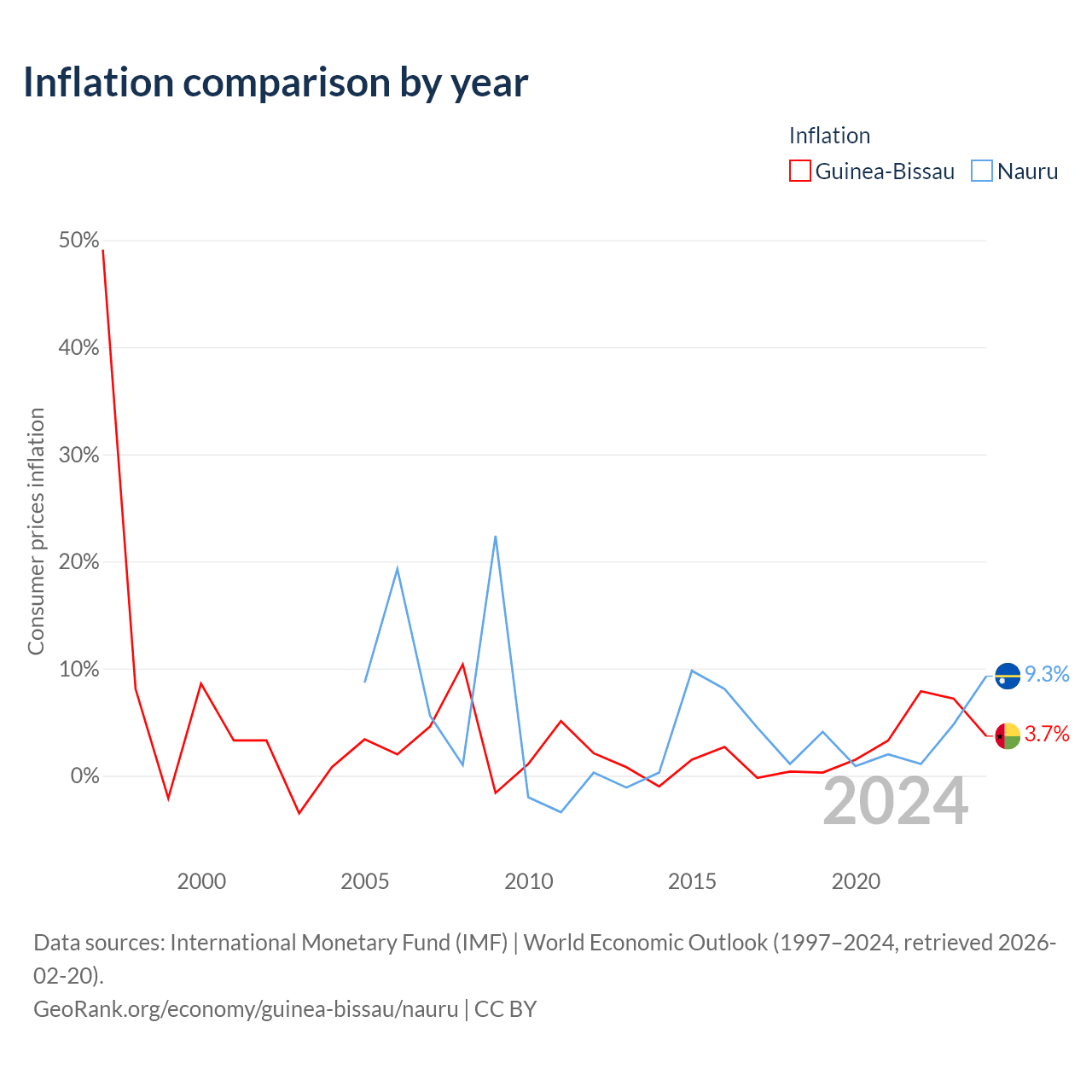 Over the past 20 years, Guinea-Bissau has recorded an average annual inflation rate of 2.76%, compared with 4.84% in Nauru. In 2024, inflation was 3.7% in Guinea-Bissau and 9.3% in Nauru.