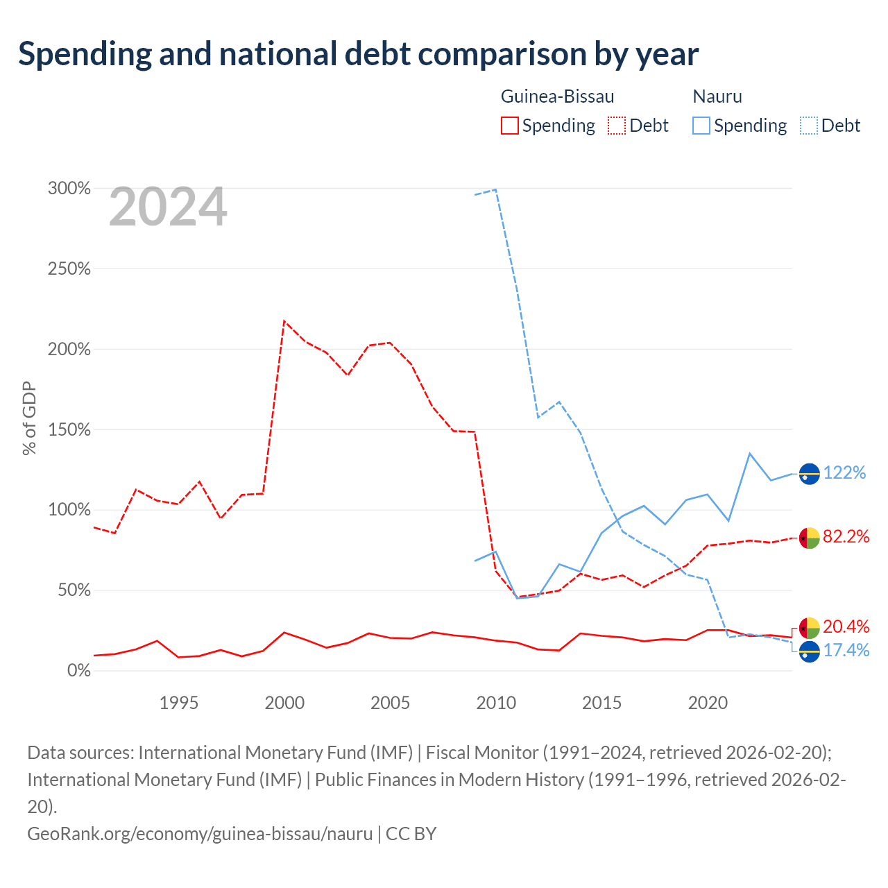 Guinea-Bissau has $1.82B in government debt (82.2% of GDP), compared to $28.3M (17.4% of GDP) in Nauru.