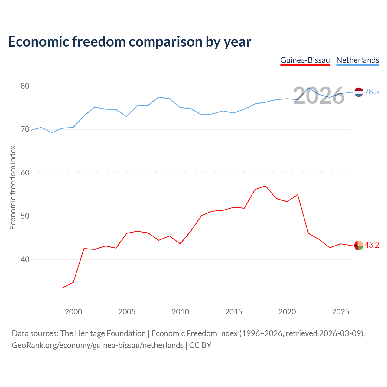 The Economic Freedom Index for Guinea-Bissau is 43.2, ranking 181/197, compared to 78.5 for the Netherlands, ranking 11/197. The chart above displays a comparison of annual changes in economic freedom indexes.