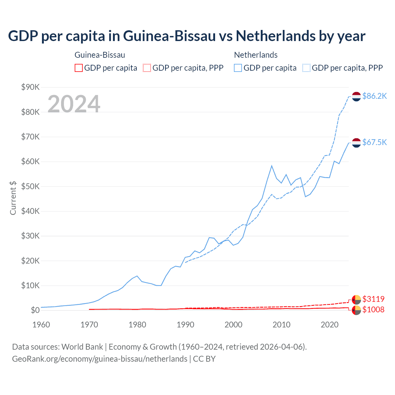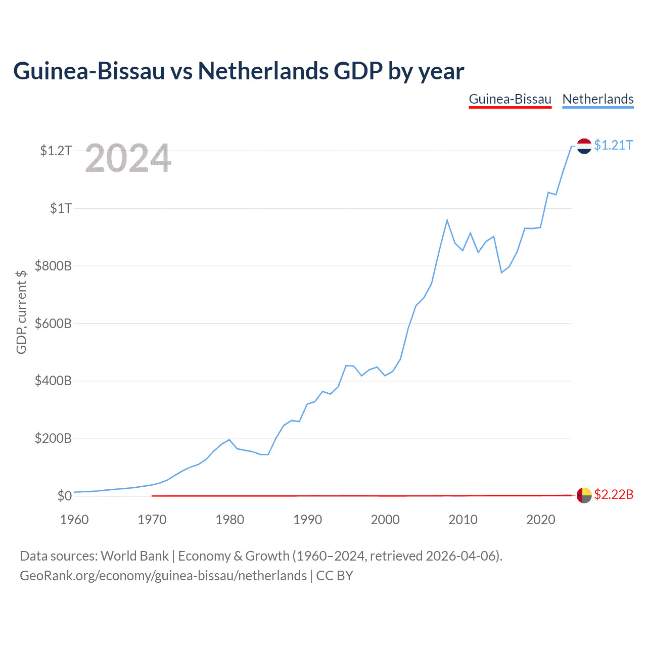 Guinea-Bissau has a GDP of $2.22B compared to $1.21T for the Netherlands, ranking 176/197 and 19/197 by economy size, respectively.