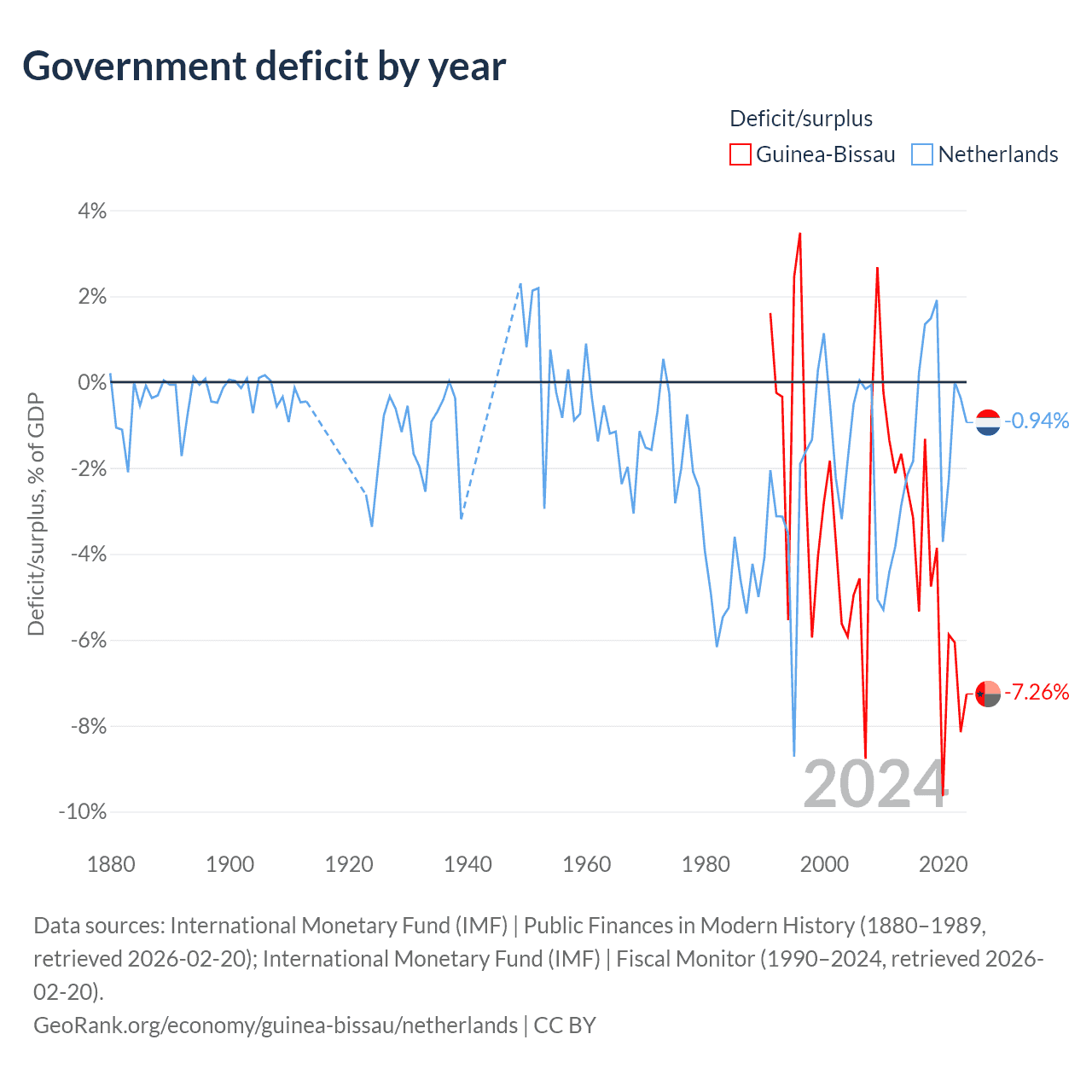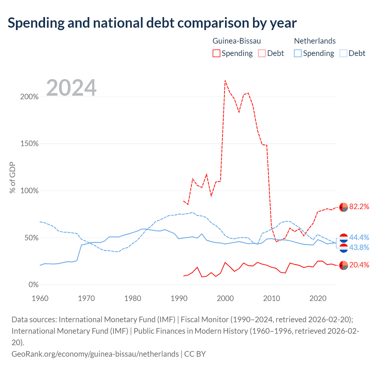 Guinea-Bissau has $1.82B in government debt (82.2% of GDP), compared to $532B (43.8% of GDP) in the Netherlands.