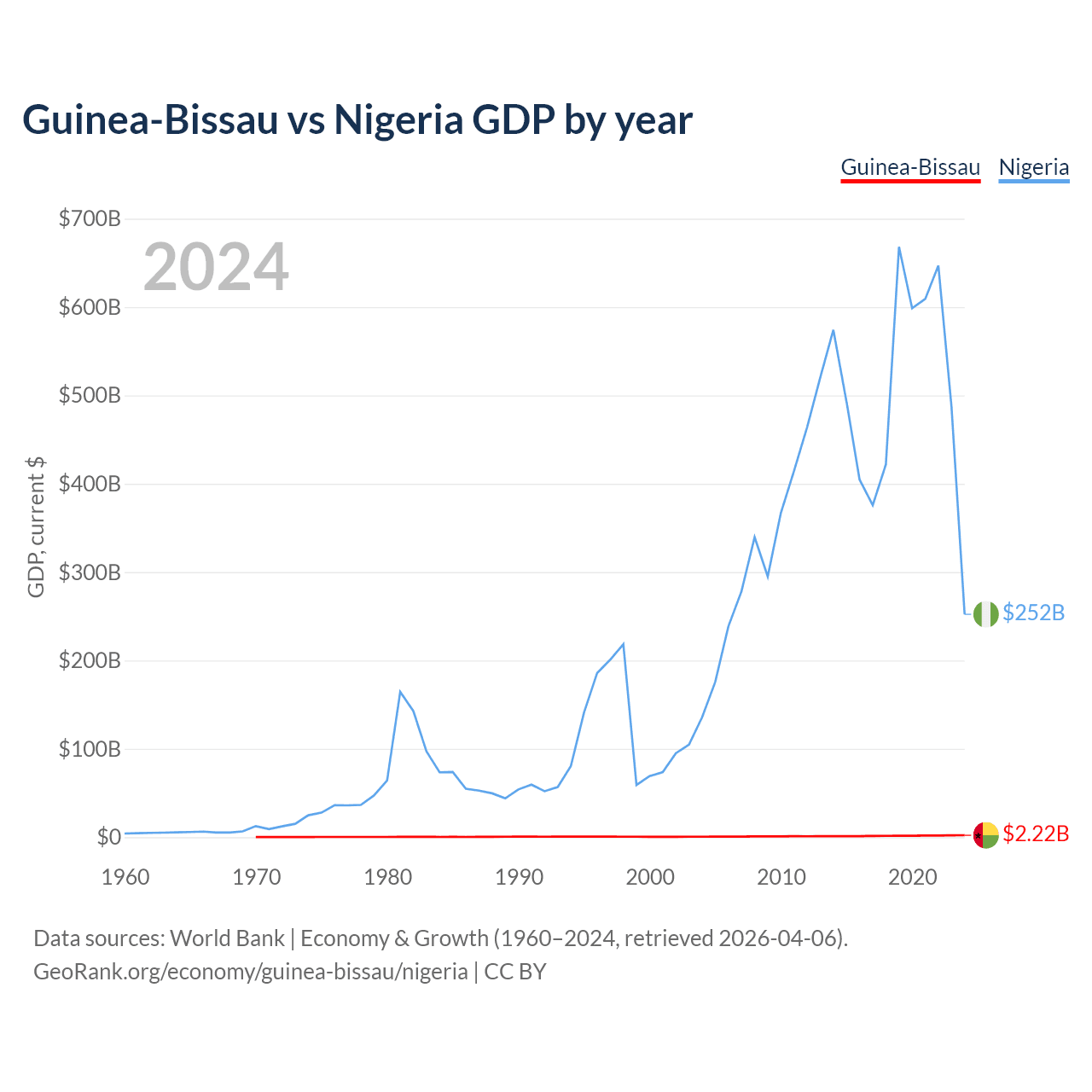 Guinea-Bissau has a GDP of $2.22B compared to $252B for Nigeria, ranking 176/197 and 54/197 by economy size, respectively.