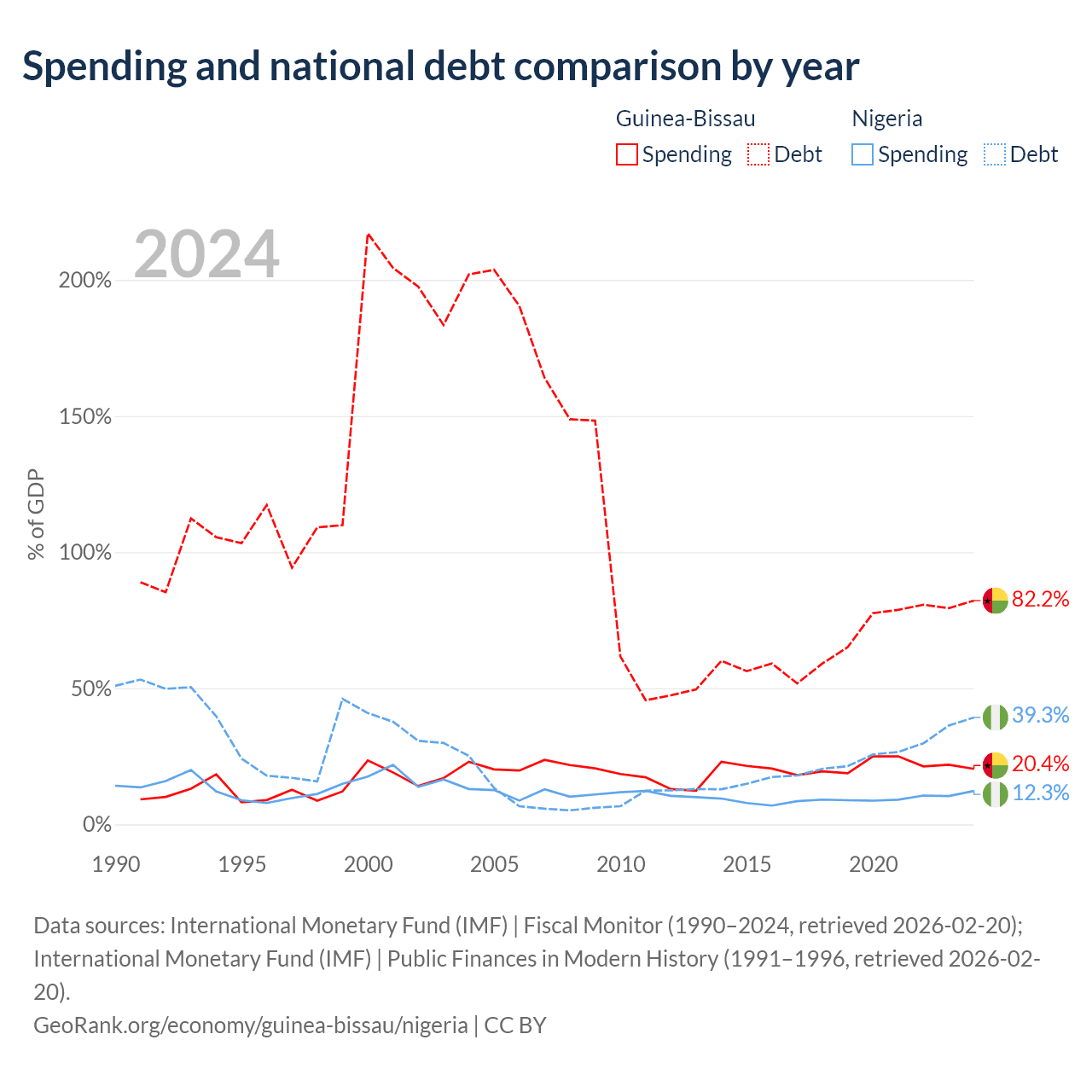 Guinea-Bissau has $1.82B in government debt (82.2% of GDP), compared to $99.2B (39.3% of GDP) in Nigeria.