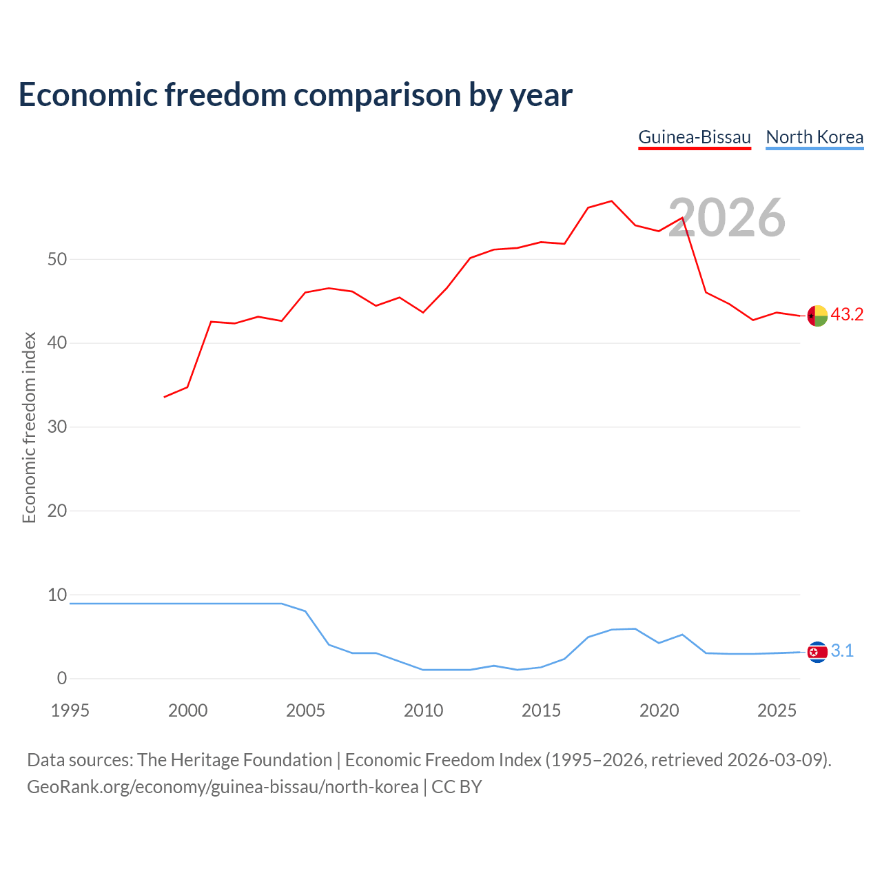 The Economic Freedom Index for Guinea-Bissau is 43.2, ranking 181/197, compared to 3.1 for North Korea, ranking 197/197. The chart above displays a comparison of annual changes in economic freedom indexes.