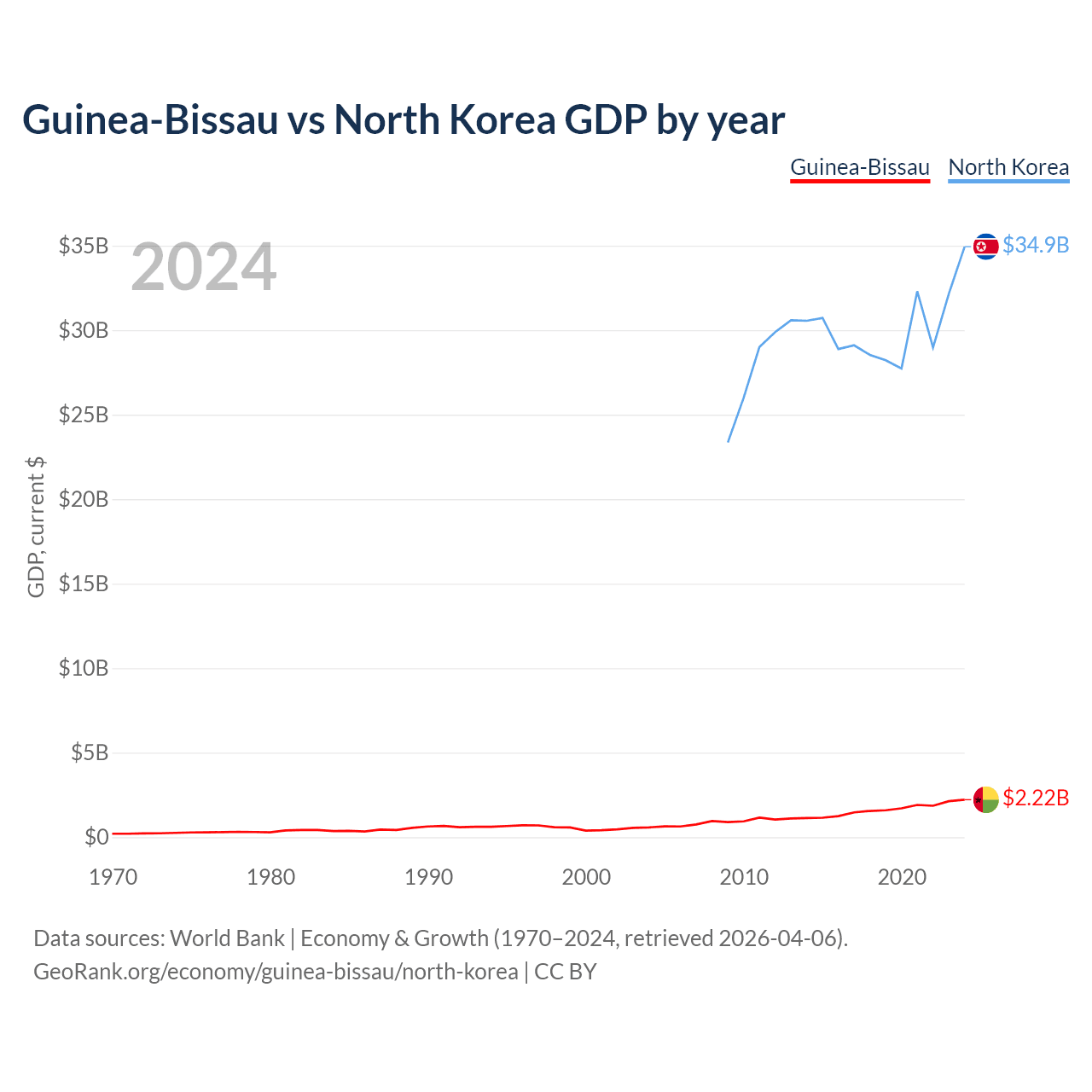 Guinea-Bissau has a GDP of $2.22B compared to $34.9B for North Korea, ranking 176/197 and 106/197 by economy size, respectively.