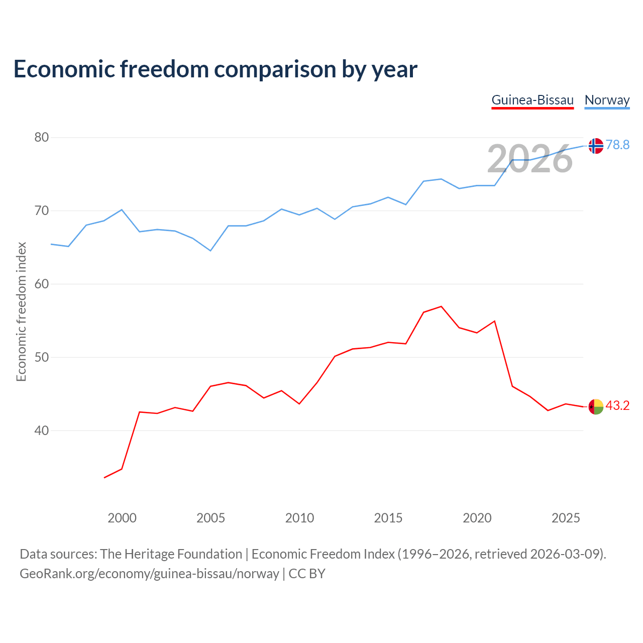 The Economic Freedom Index for Guinea-Bissau is 43.2, ranking 181/197, compared to 78.8 for Norway, ranking 9/197. The chart above displays a comparison of annual changes in economic freedom indexes.