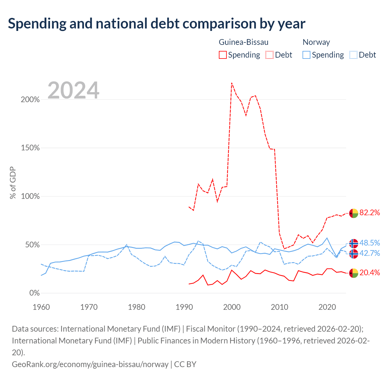 Guinea-Bissau has $1.82B in government debt (82.2% of GDP), compared to $207B (42.7% of GDP) in Norway.