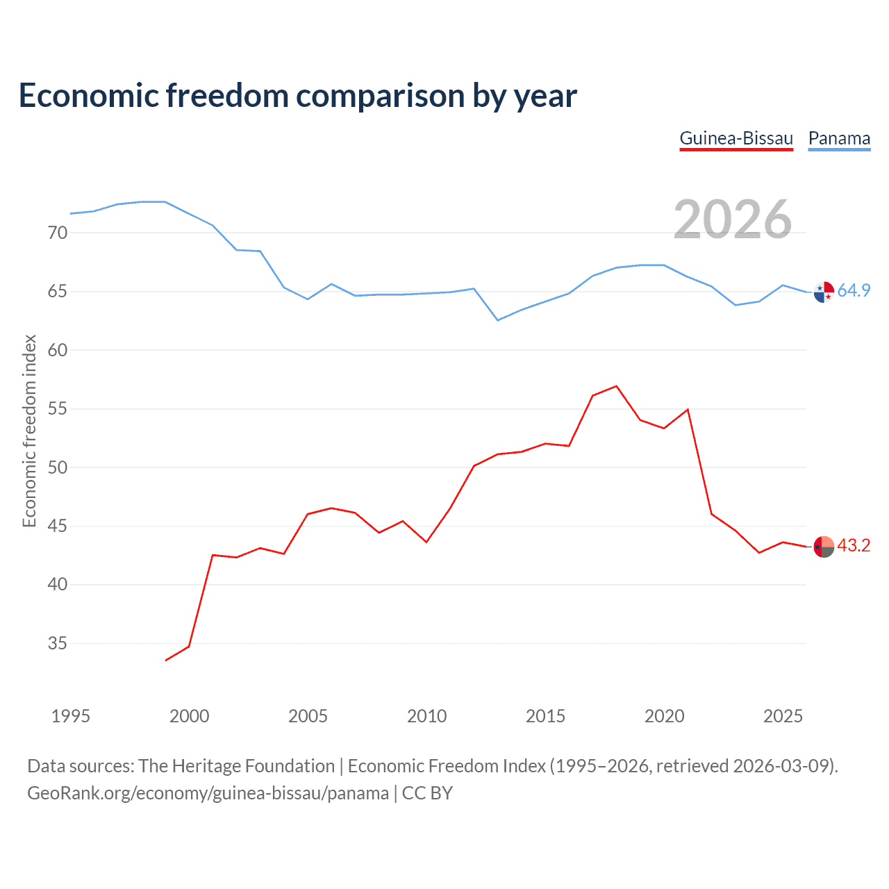 The Economic Freedom Index for Guinea-Bissau is 43.2, ranking 181/197, compared to 64.9 for Panama, ranking 70/197. The chart above displays a comparison of annual changes in economic freedom indexes.