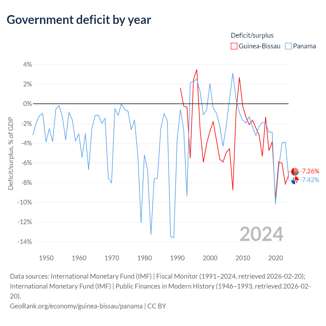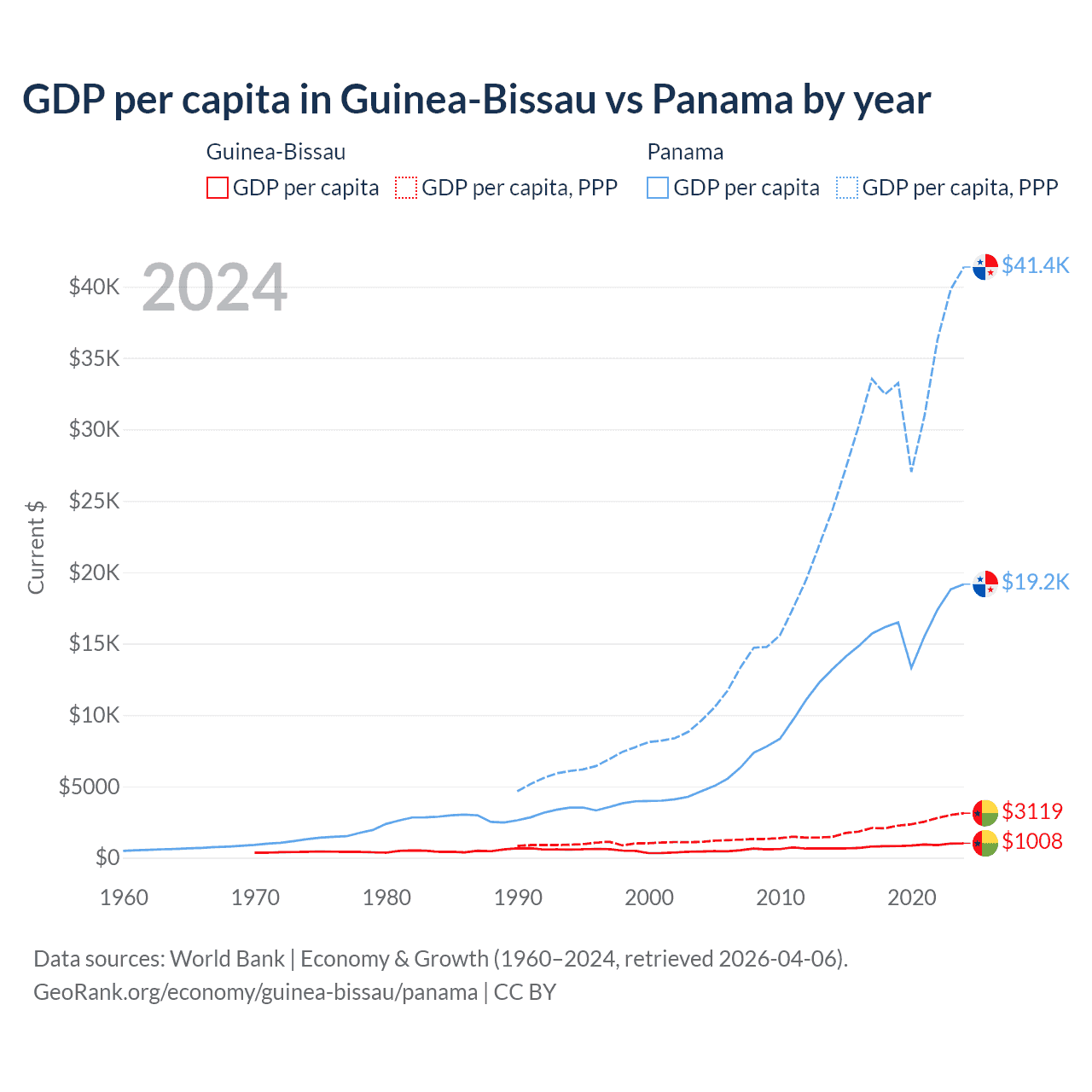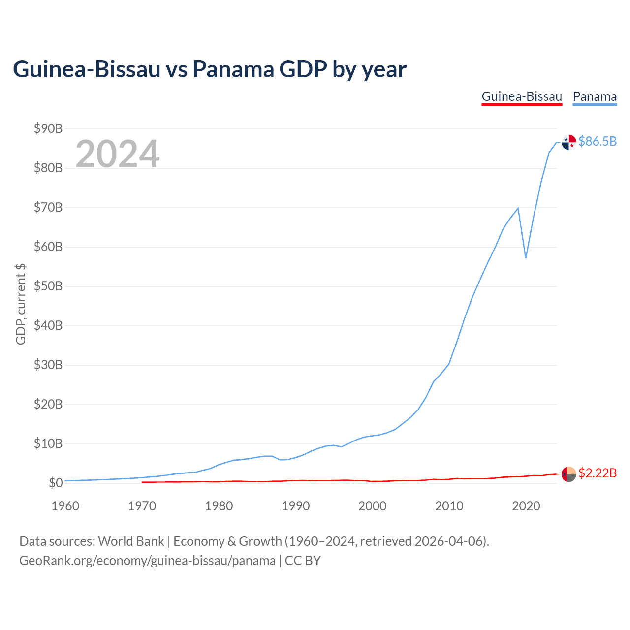 Guinea-Bissau has a GDP of $2.22B compared to $86.5B for Panama, ranking 176/197 and 78/197 by economy size, respectively.