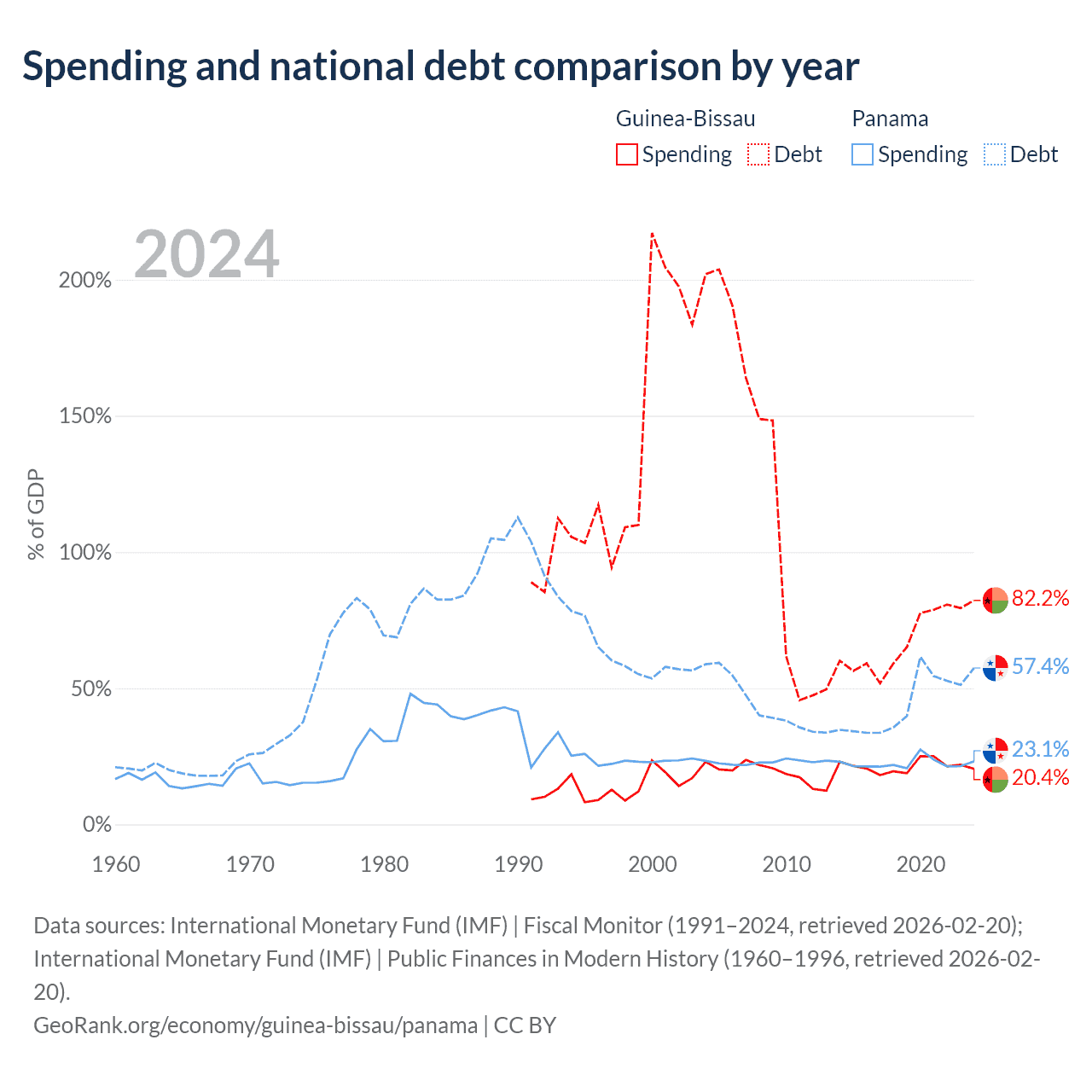 Guinea-Bissau has $1.82B in government debt (82.2% of GDP), compared to $49.6B (57.4% of GDP) in Panama.
