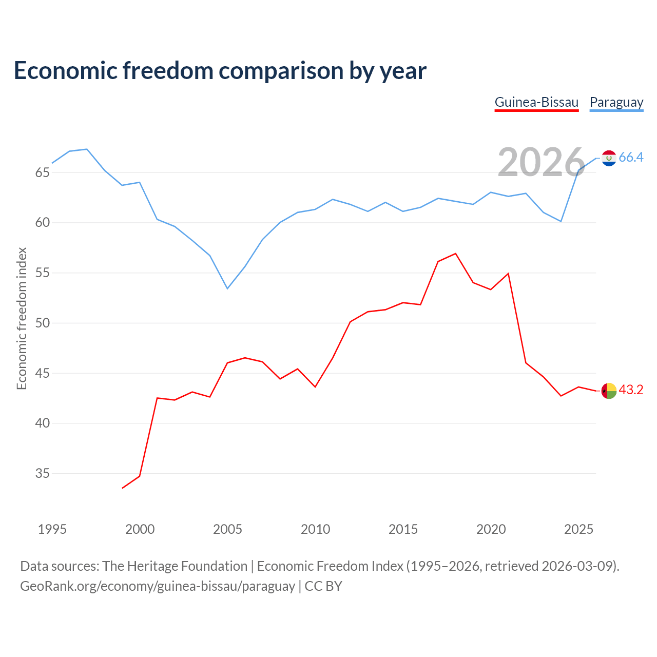 The Economic Freedom Index for Guinea-Bissau is 43.2, ranking 181/197, compared to 66.4 for Paraguay, ranking 61/197. The chart above displays a comparison of annual changes in economic freedom indexes.