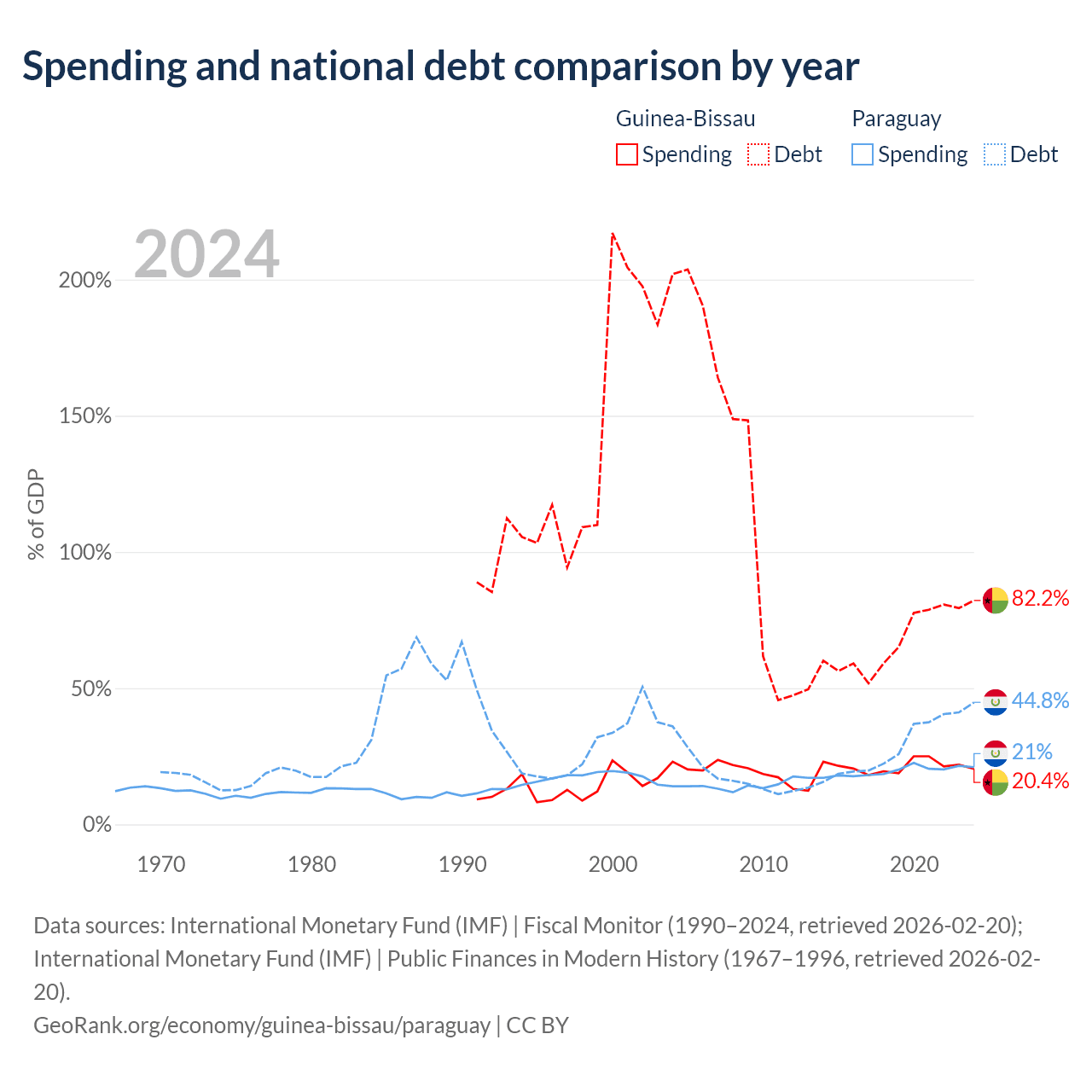 Guinea-Bissau has $1.82B in government debt (82.2% of GDP), compared to $19.9B (44.8% of GDP) in Paraguay.