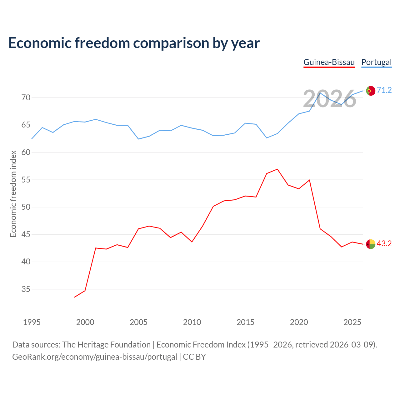 The Economic Freedom Index for Guinea-Bissau is 43.2, ranking 181/197, compared to 71.2 for Portugal, ranking 33/197. The chart above displays a comparison of annual changes in economic freedom indexes.