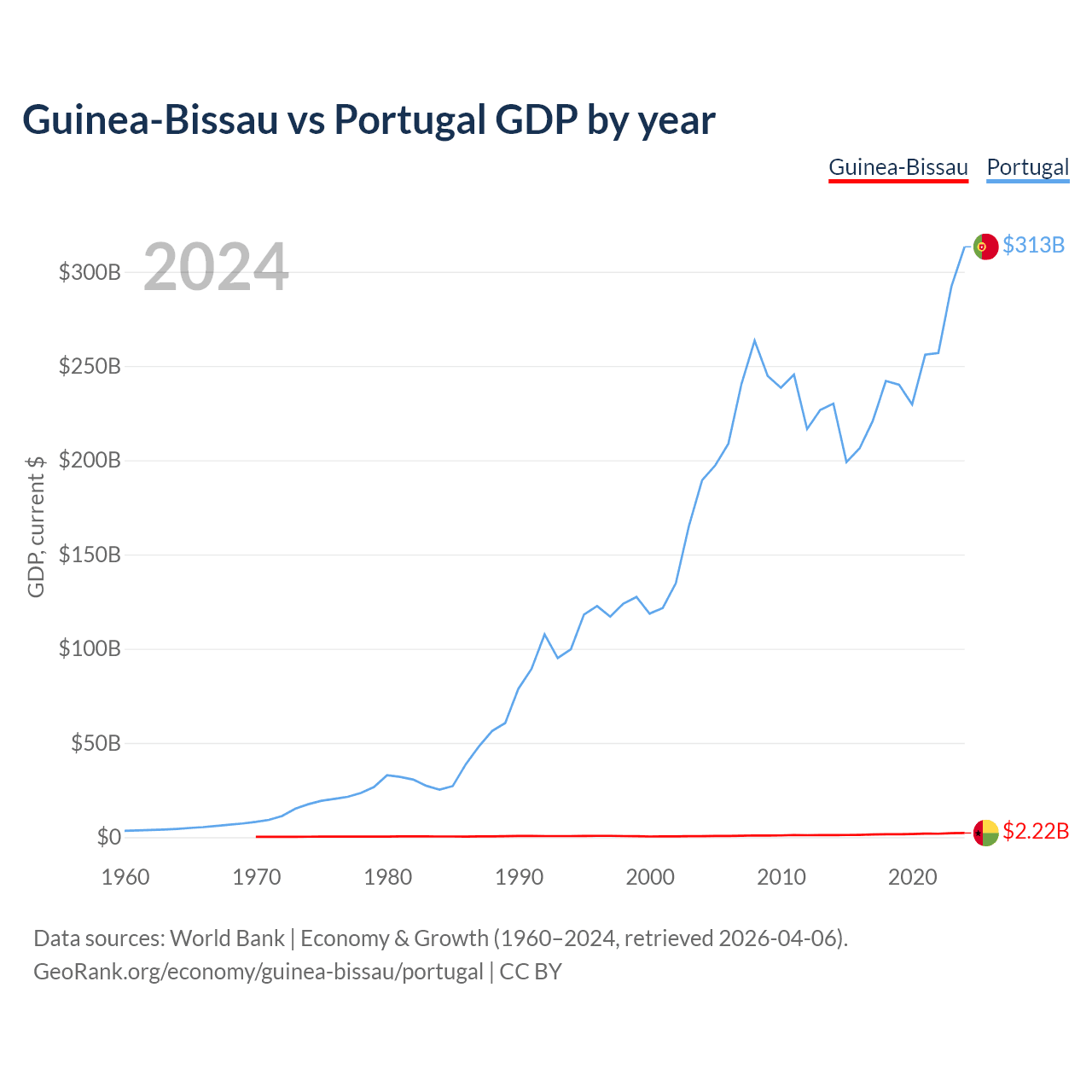 Guinea-Bissau has a GDP of $2.22B compared to $313B for Portugal, ranking 176/197 and 46/197 by economy size, respectively.