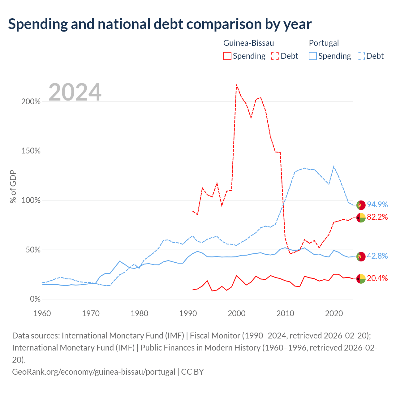 Guinea-Bissau has $1.82B in government debt (82.2% of GDP), compared to $297B (94.9% of GDP) in Portugal.