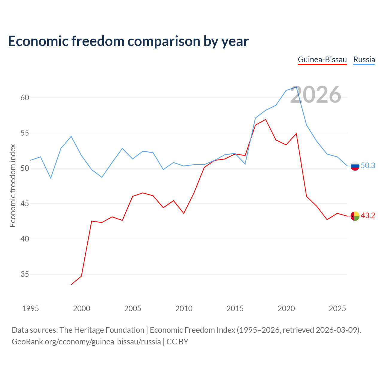 The Economic Freedom Index for Guinea-Bissau is 43.2, ranking 181/197, compared to 50.3 for Russia, ranking 161/197. The chart above displays a comparison of annual changes in economic freedom indexes.