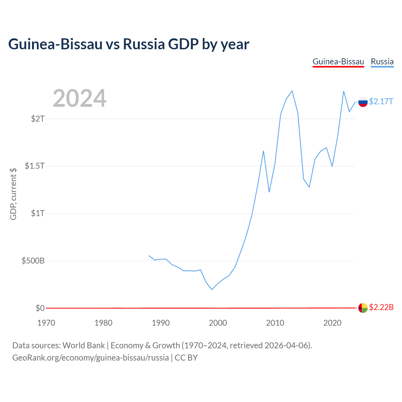 Guinea-Bissau has a GDP of $2.22B compared to $2.17T for Russia, ranking 176/197 and 11/197 by economy size, respectively.
