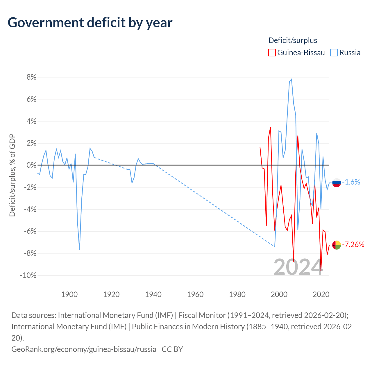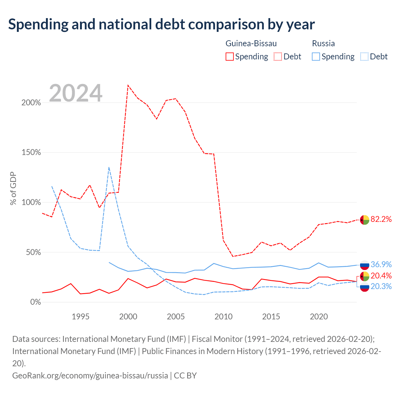 Guinea-Bissau has $1.82B in government debt (82.2% of GDP), compared to $440B (20.3% of GDP) in Russia.