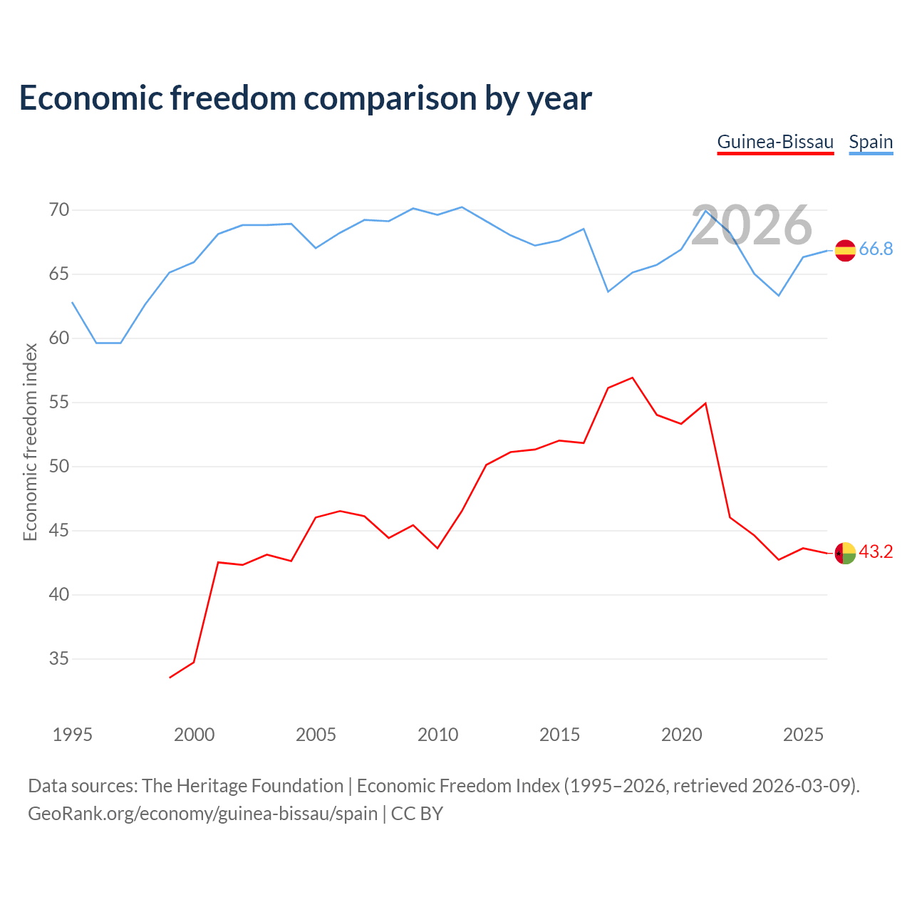 The Economic Freedom Index for Guinea-Bissau is 43.2, ranking 181/197, compared to 66.8 for Spain, ranking 59/197. The chart above displays a comparison of annual changes in economic freedom indexes.