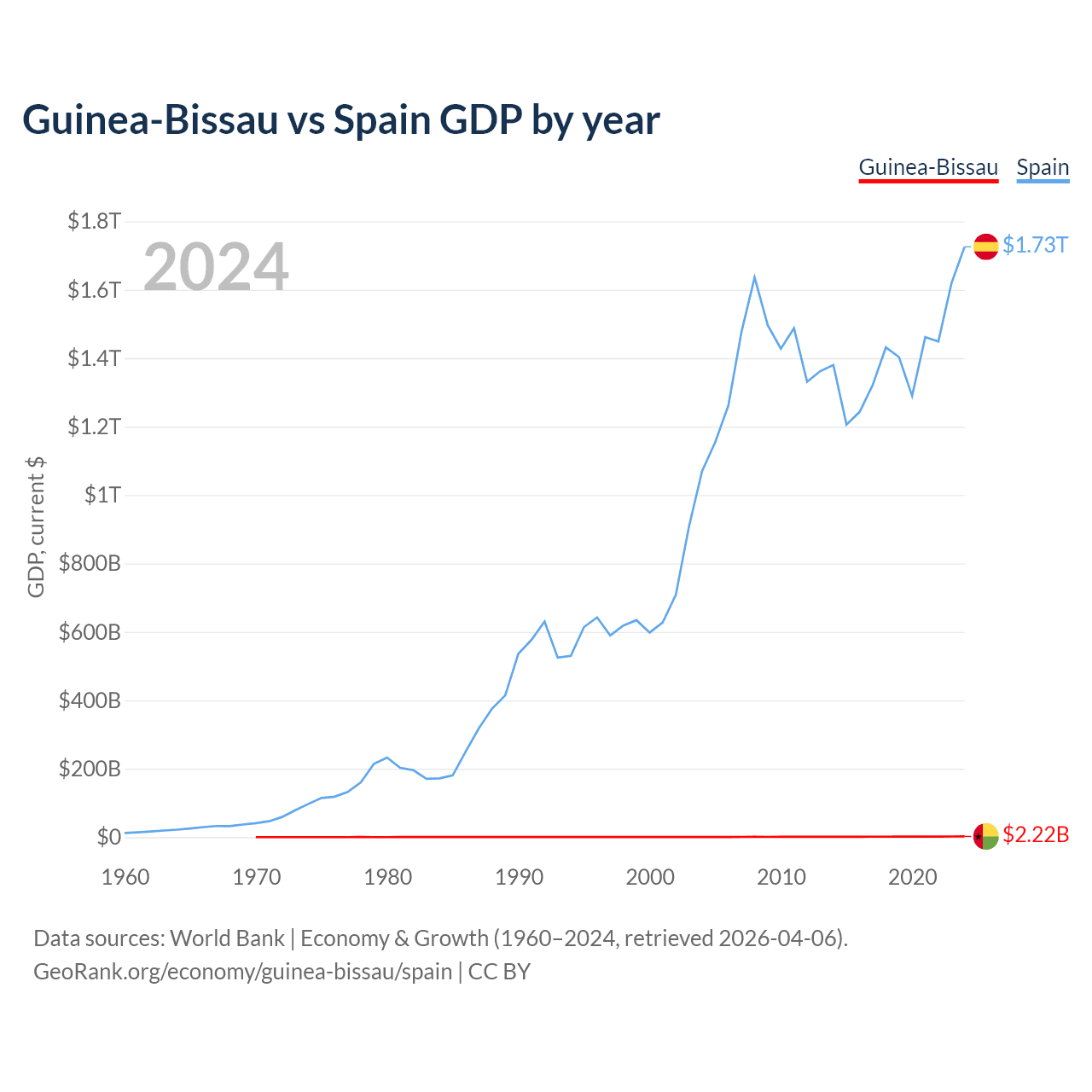 Guinea-Bissau has a GDP of $2.22B compared to $1.73T for Spain, ranking 176/197 and 15/197 by economy size, respectively.