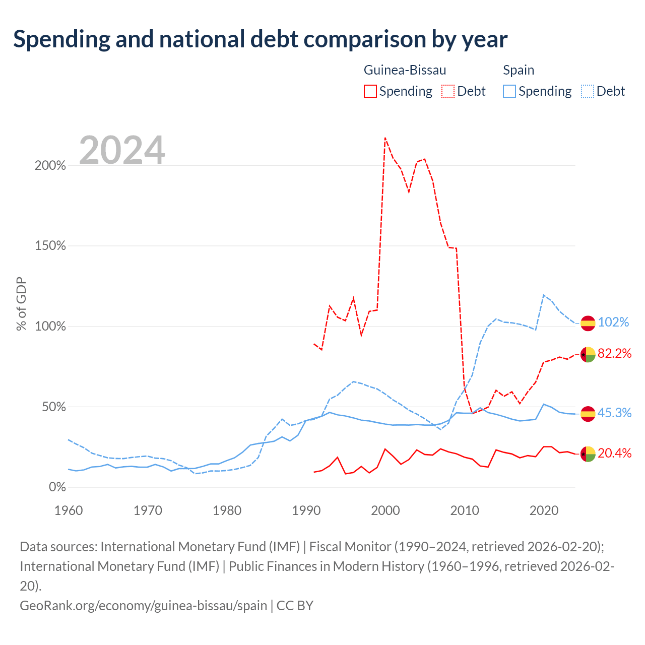 Guinea-Bissau has $1.82B in government debt (82.2% of GDP), compared to $1.75T (101.6% of GDP) in Spain.