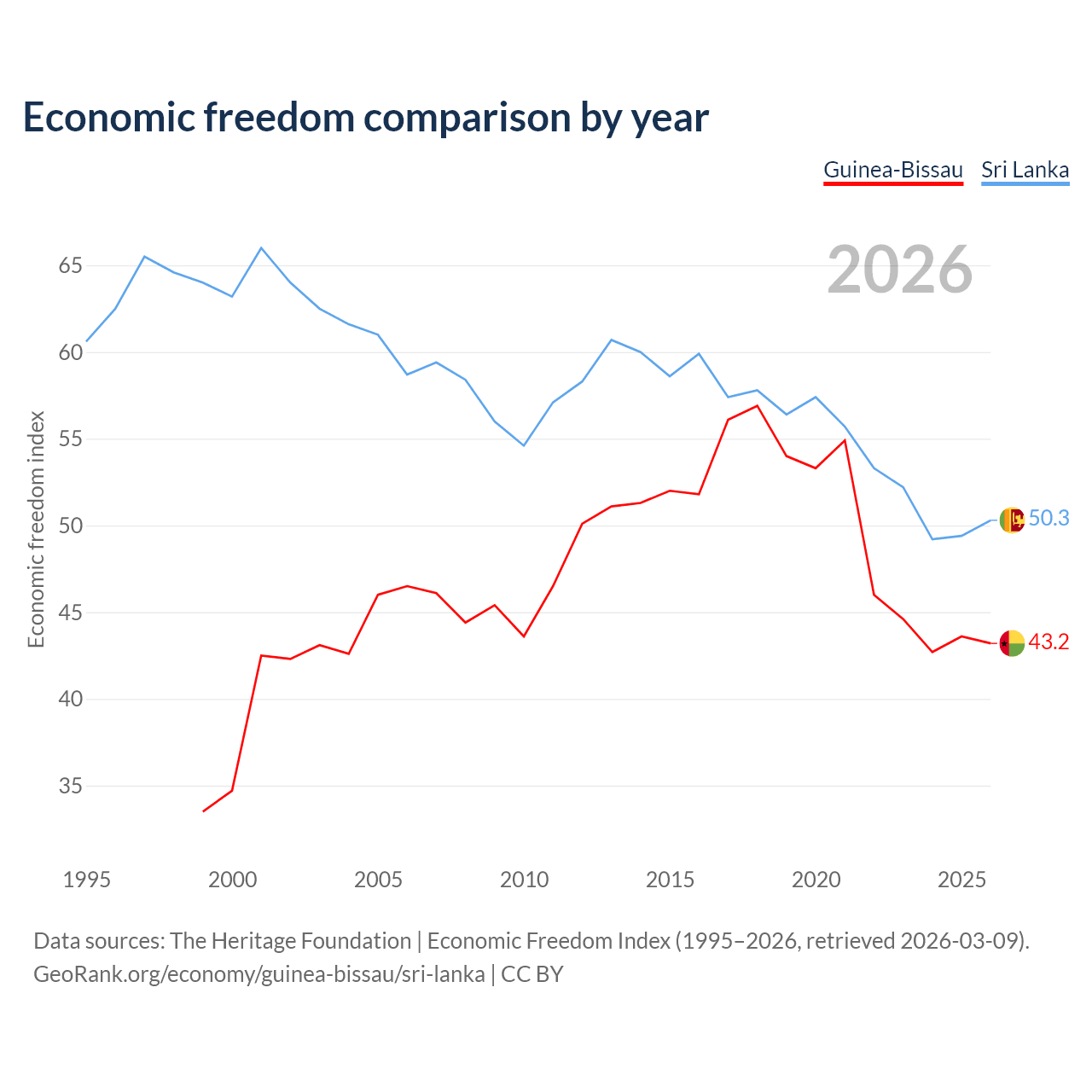 The Economic Freedom Index for Guinea-Bissau is 43.2, ranking 181/197, compared to 50.3 for Sri Lanka, ranking 162/197. The chart above displays a comparison of annual changes in economic freedom indexes.