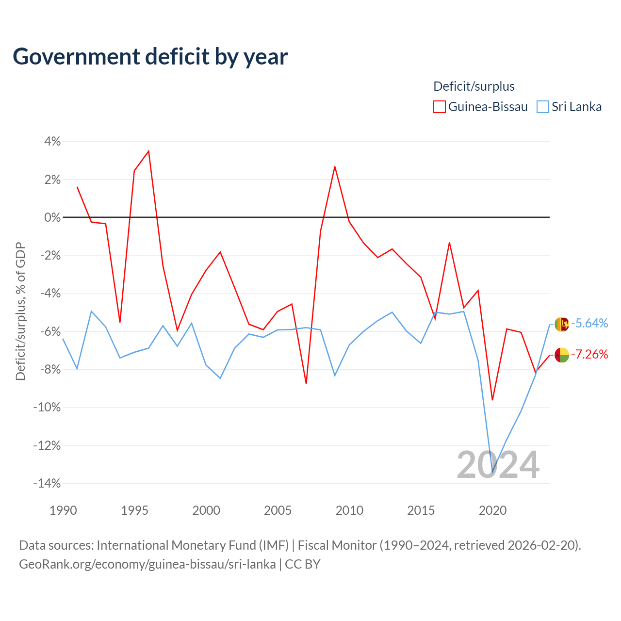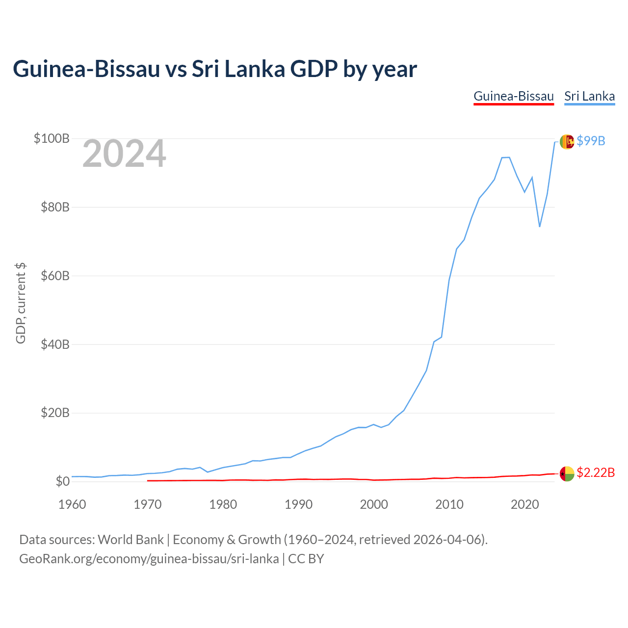 Guinea-Bissau has a GDP of $2.22B compared to $99B for Sri Lanka, ranking 176/197 and 72/197 by economy size, respectively.