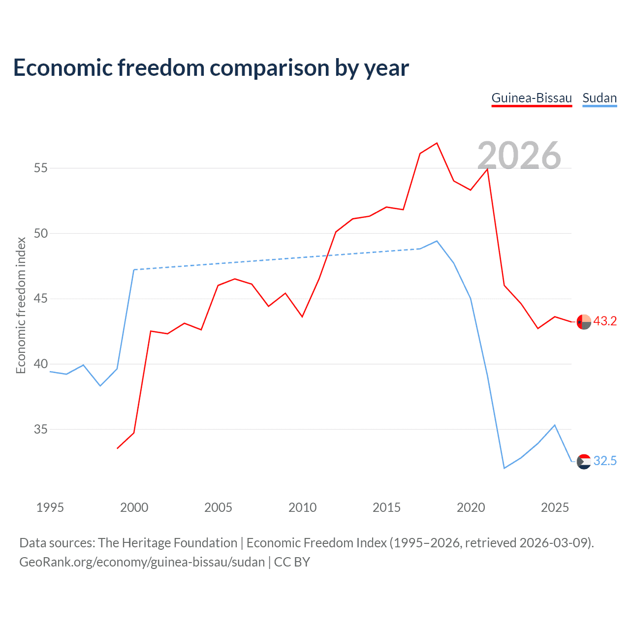 The Economic Freedom Index for Guinea-Bissau is 43.2, ranking 181/197, compared to 32.5 for Sudan, ranking 191/197. The chart above displays a comparison of annual changes in economic freedom indexes.