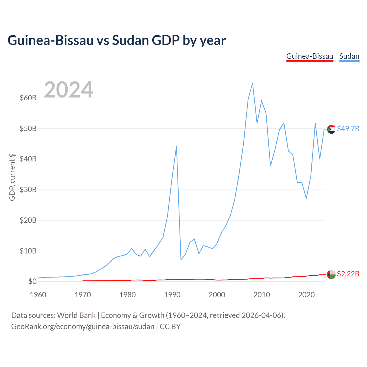 Guinea-Bissau has a GDP of $2.22B compared to $49.7B for Sudan, ranking 176/197 and 94/197 by economy size, respectively.