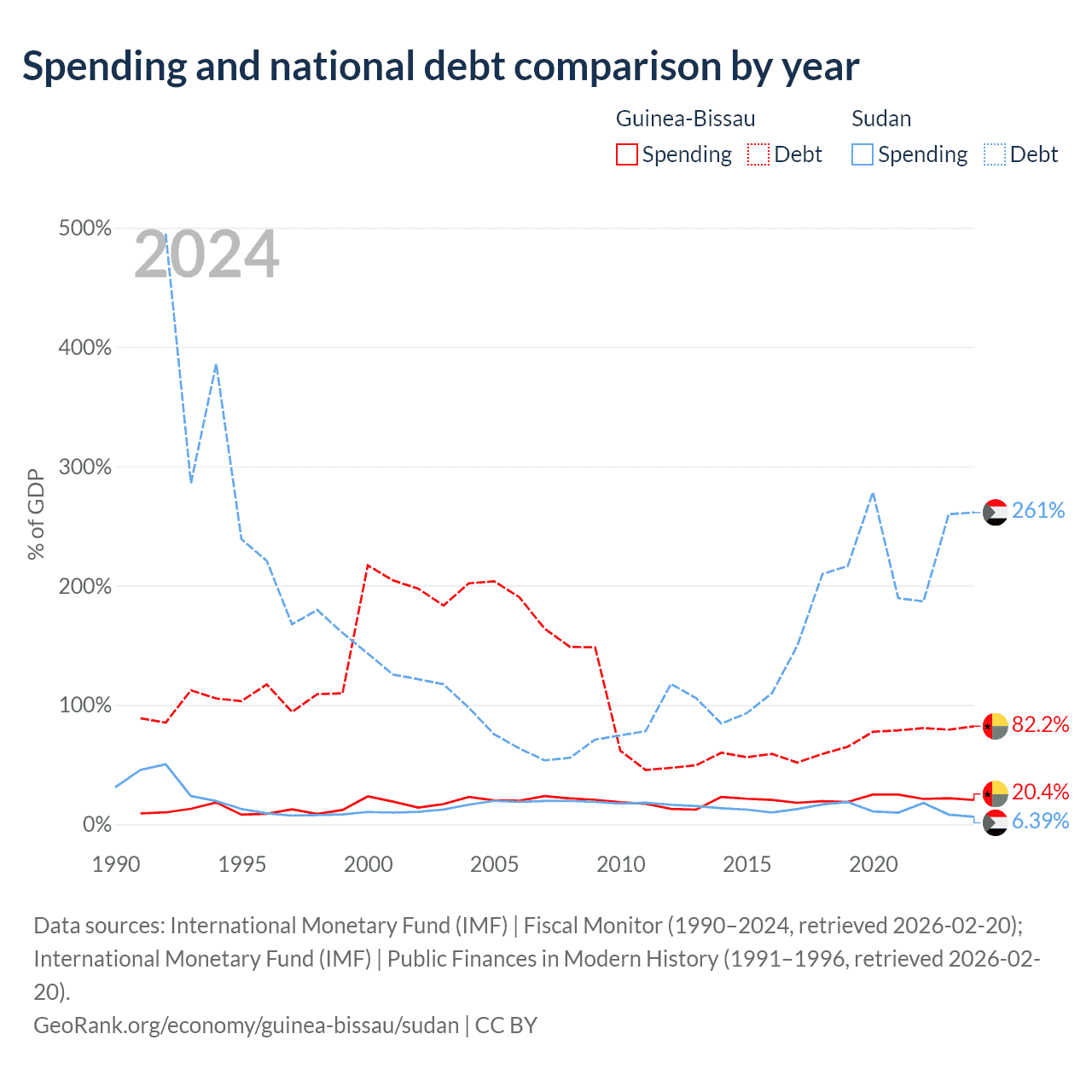 Guinea-Bissau has $1.82B in government debt (82.2% of GDP), compared to $130B (261.4% of GDP) in Sudan.
