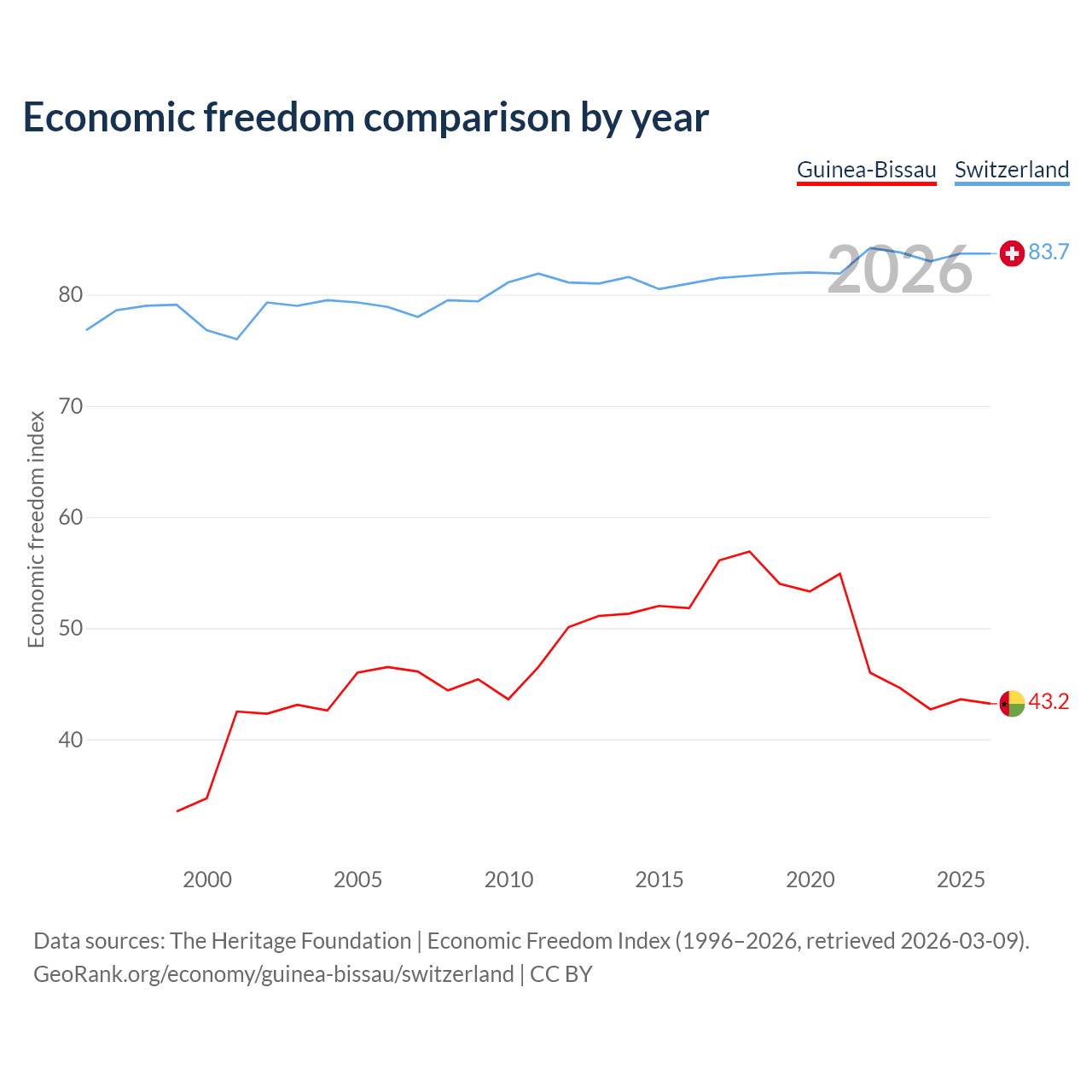 The Economic Freedom Index for Guinea-Bissau is 43.2, ranking 181/197, compared to 83.7 for Switzerland, ranking 2/197. The chart above displays a comparison of annual changes in economic freedom indexes.