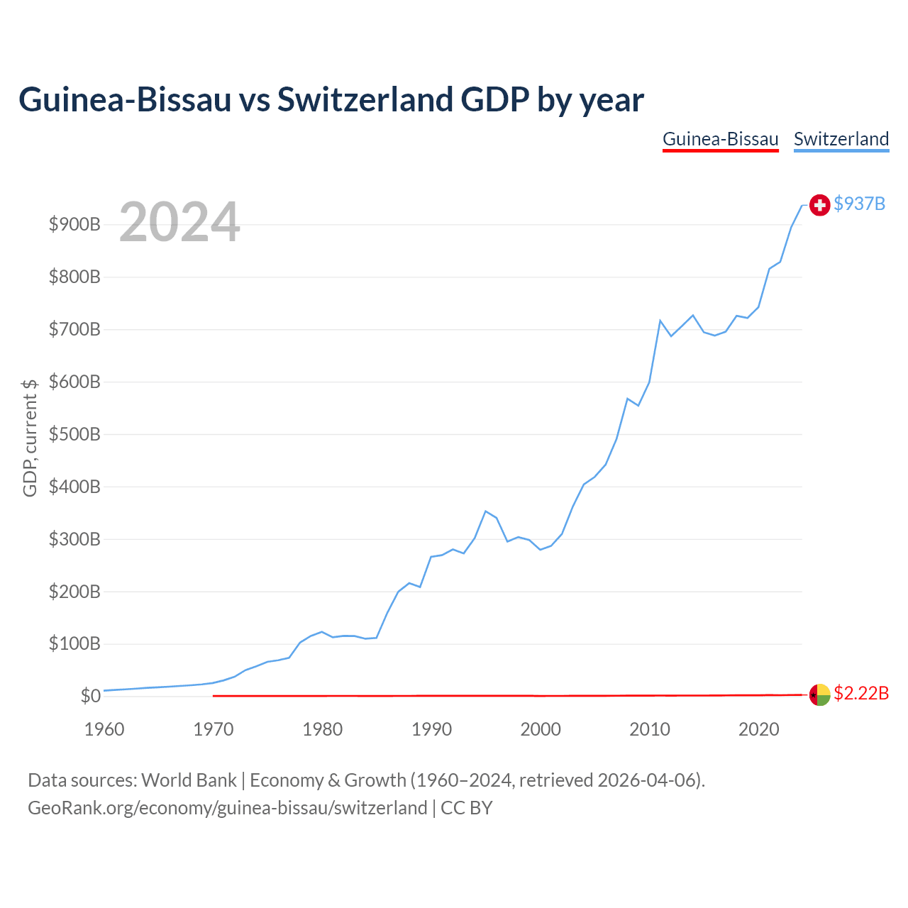 Guinea-Bissau has a GDP of $2.22B compared to $937B for Switzerland, ranking 176/197 and 20/197 by economy size, respectively.