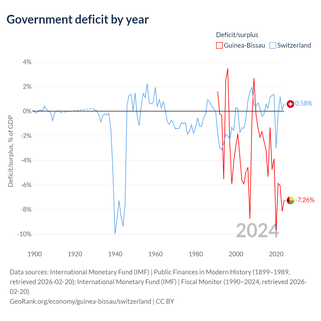 Guinea-Bissau has $1.82B in government debt (82.2% of GDP), compared to $351B (37.5% of GDP) in Switzerland.
