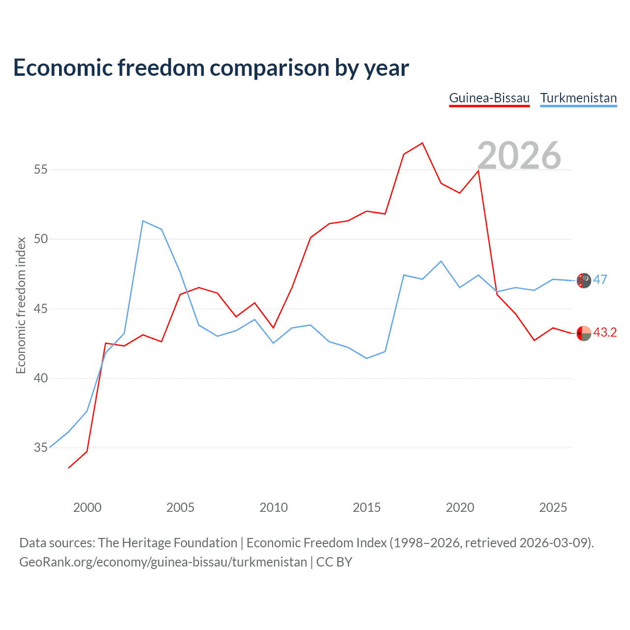The Economic Freedom Index for Guinea-Bissau is 43.2, ranking 181/197, compared to 47 for Turkmenistan, ranking 177/197. The chart above displays a comparison of annual changes in economic freedom indexes.