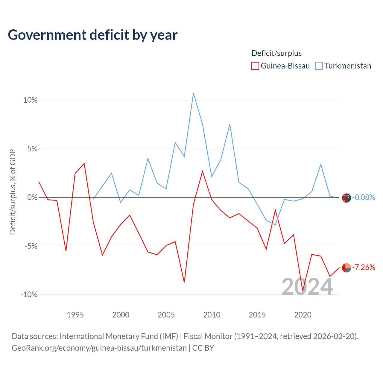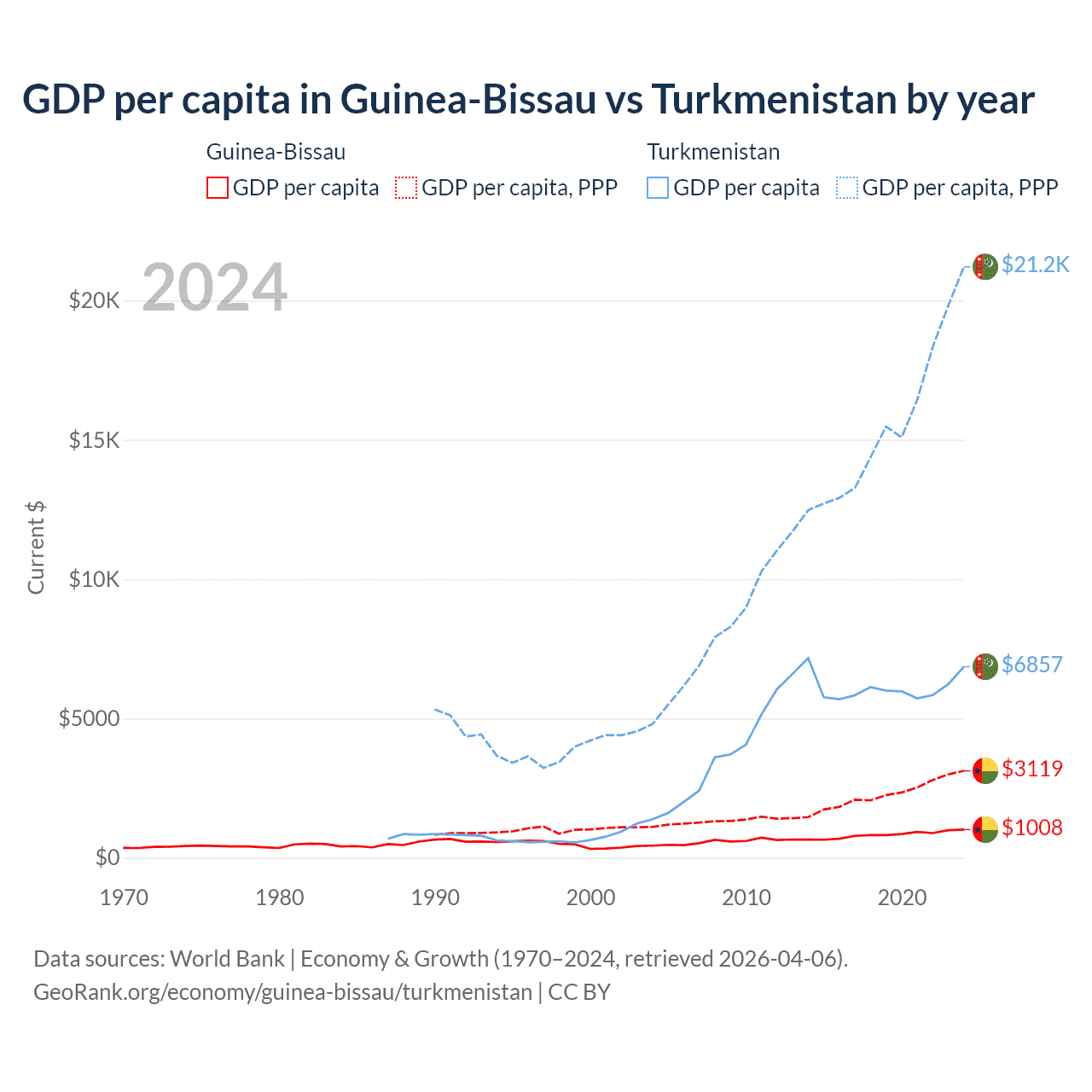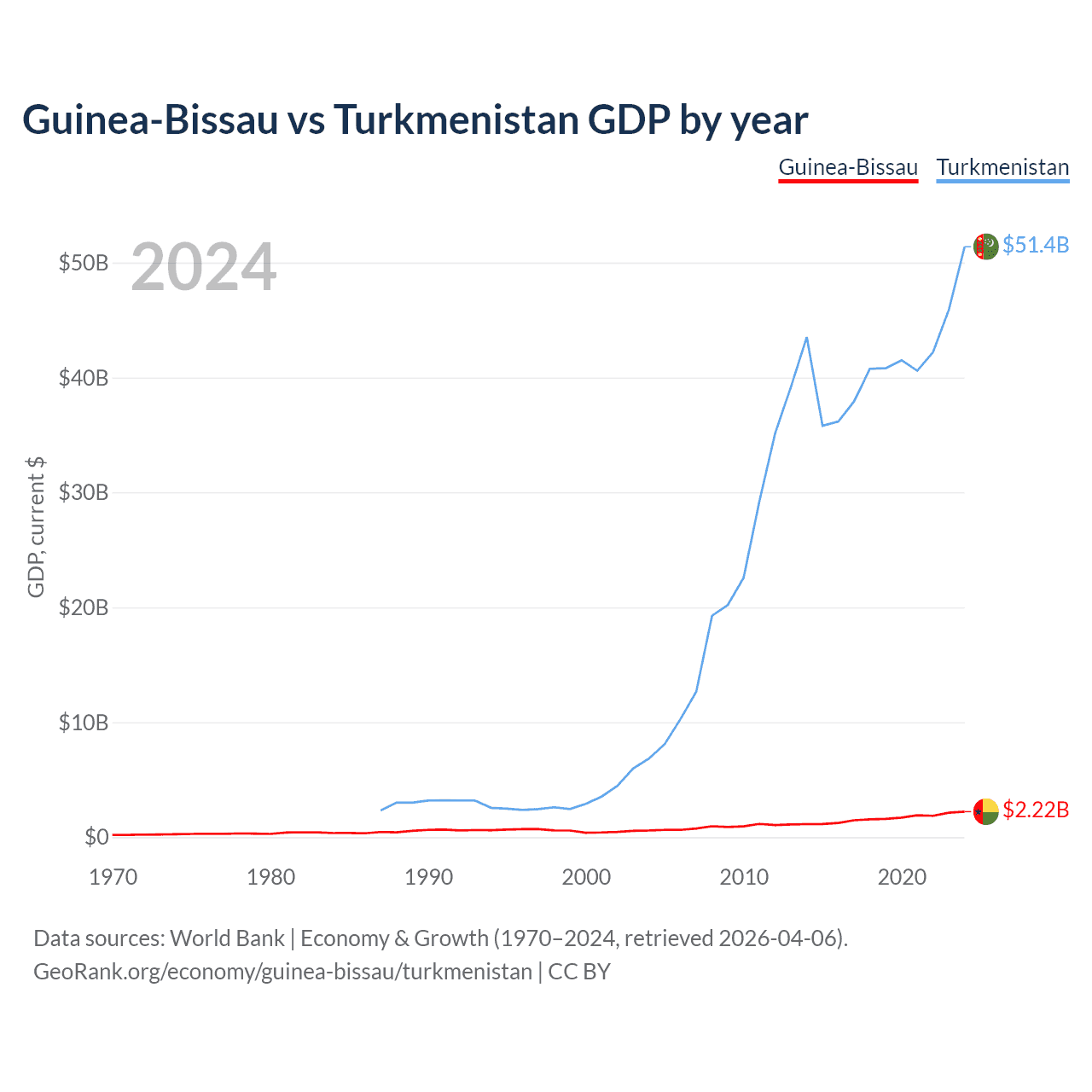 Guinea-Bissau has a GDP of $2.22B compared to $51.4B for Turkmenistan, ranking 176/197 and 92/197 by economy size, respectively.