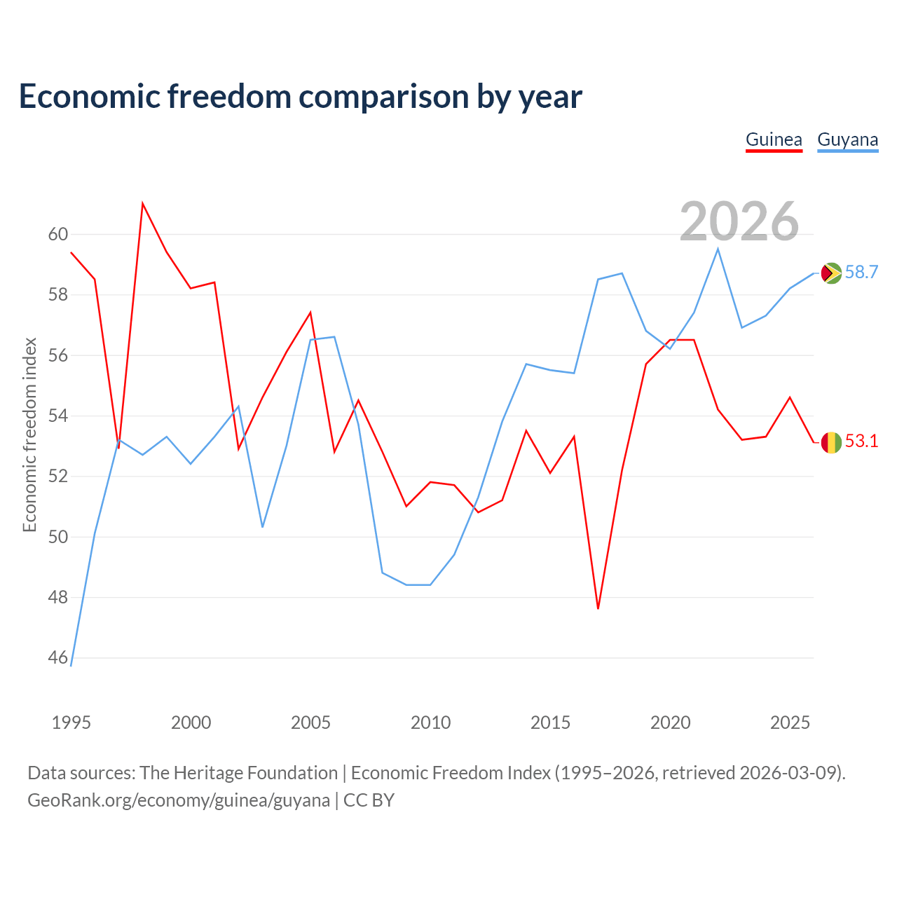 The Economic Freedom Index for Guinea is 53.1, ranking 141/197, compared to 58.7 for Guyana, ranking 109/197. The chart above displays a comparison of annual changes in economic freedom indexes.